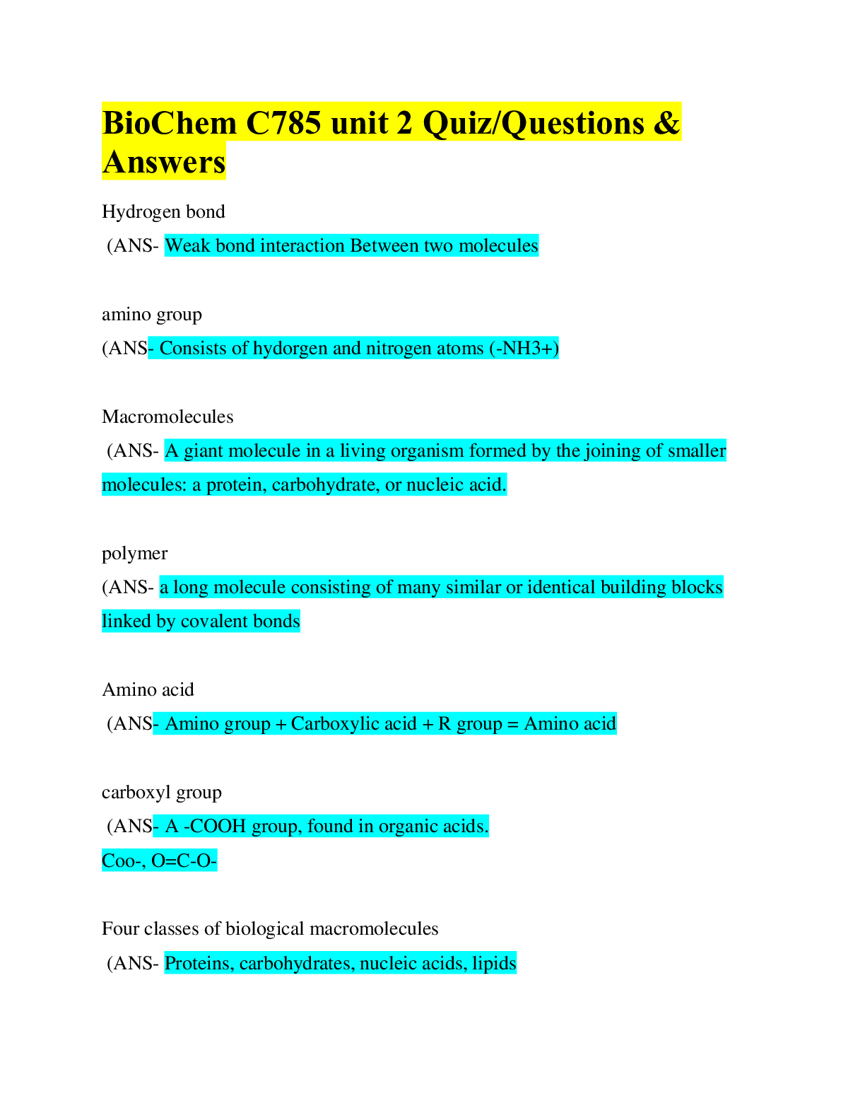 BioChemistry > EXAMs > BioChem C785 unit 2 Quiz/Questions & Answers/WGU (All)