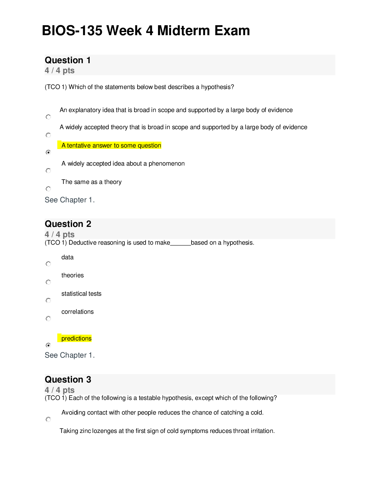 BioChemistry > EXAM > BIOS-135 Week 4 Midterm Exam (Multiple Choice, Short & Essay Questions) | ALL 100% CORRECT ANSWERS | Download To Score An A (All)
