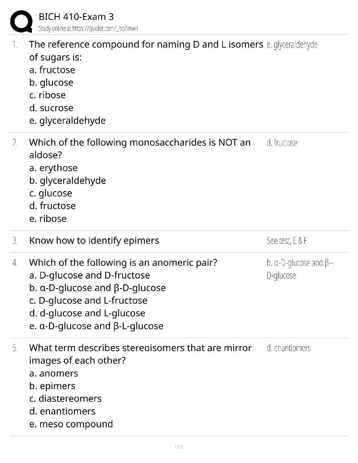BioChemistry > QUESTIONS & ANSWERS > BICH 409 Carbohydrates / Study Guide / Test Bank / Practice Questions / Score 100% – 2025 Update (All)