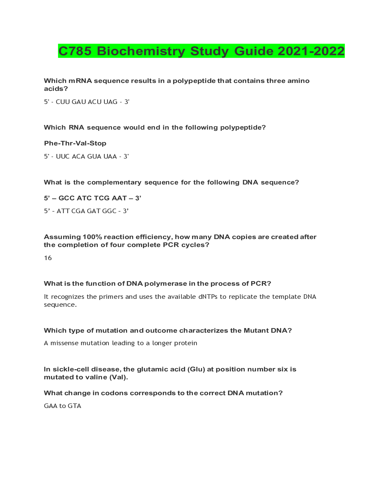BioChemistry > EXAM > C785 Biochemistry Study Guide 2021-2022 (All)