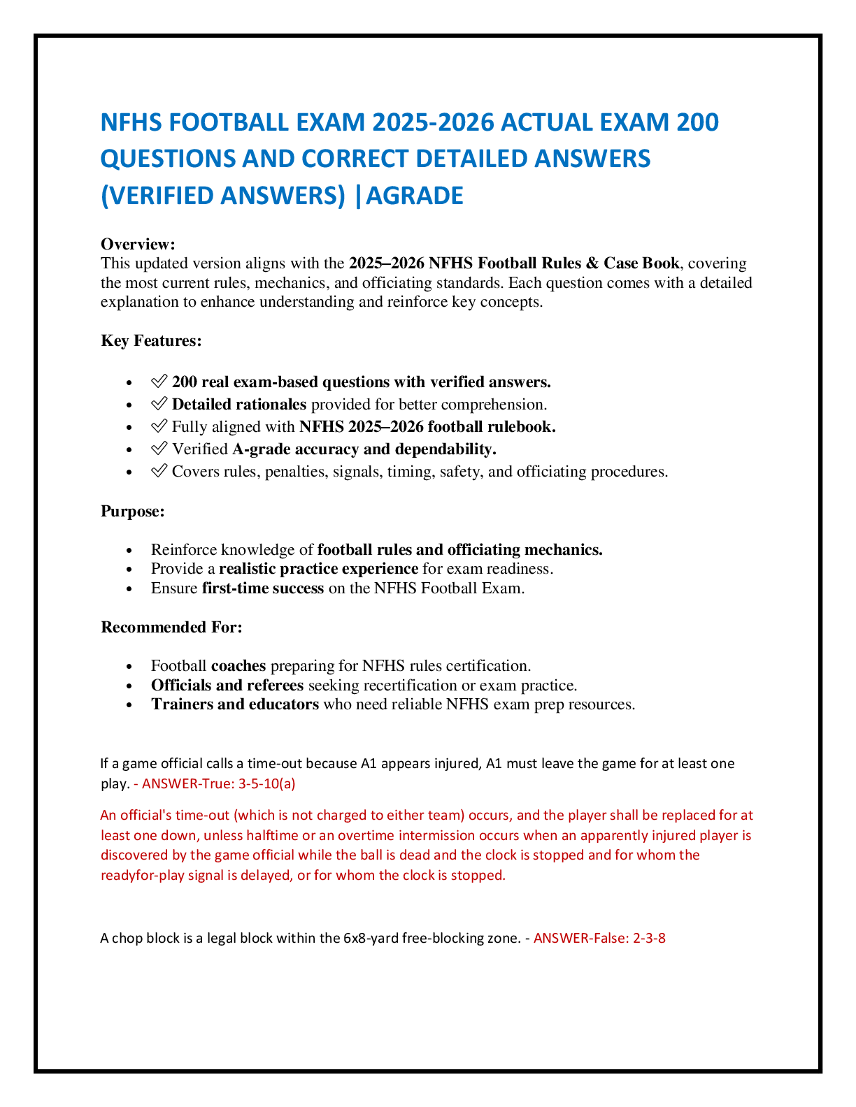 Game Theory > EXAM > NFHS FOOTBALL EXAM 2025-2026 ACTUAL EXAM 200 QUESTIONS AND CORRECT DETAILED ANSWERS (VERIFIED ANSWERS) |AGRADE (All)