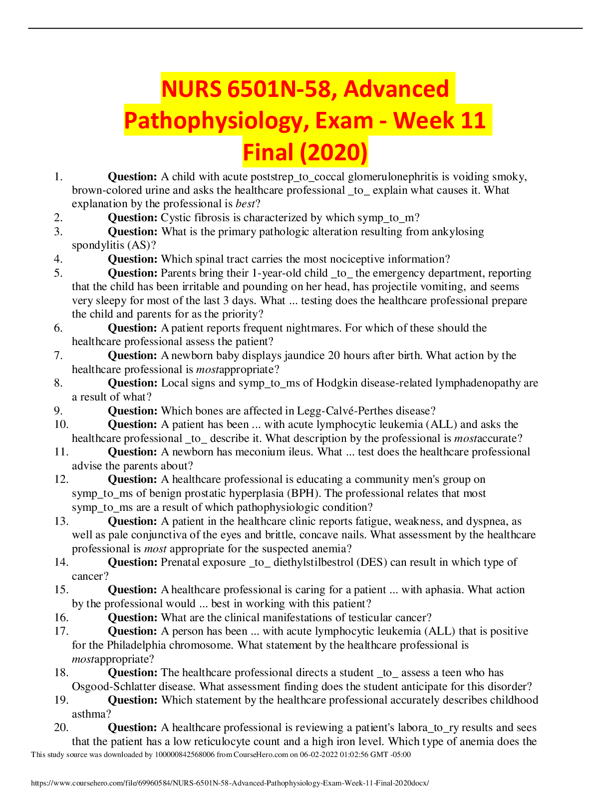 Pathophysiology > EXAM > NURS 6501N-58, Advanced Pathophysiology, Exam - Week 11 Final (2020) (All)