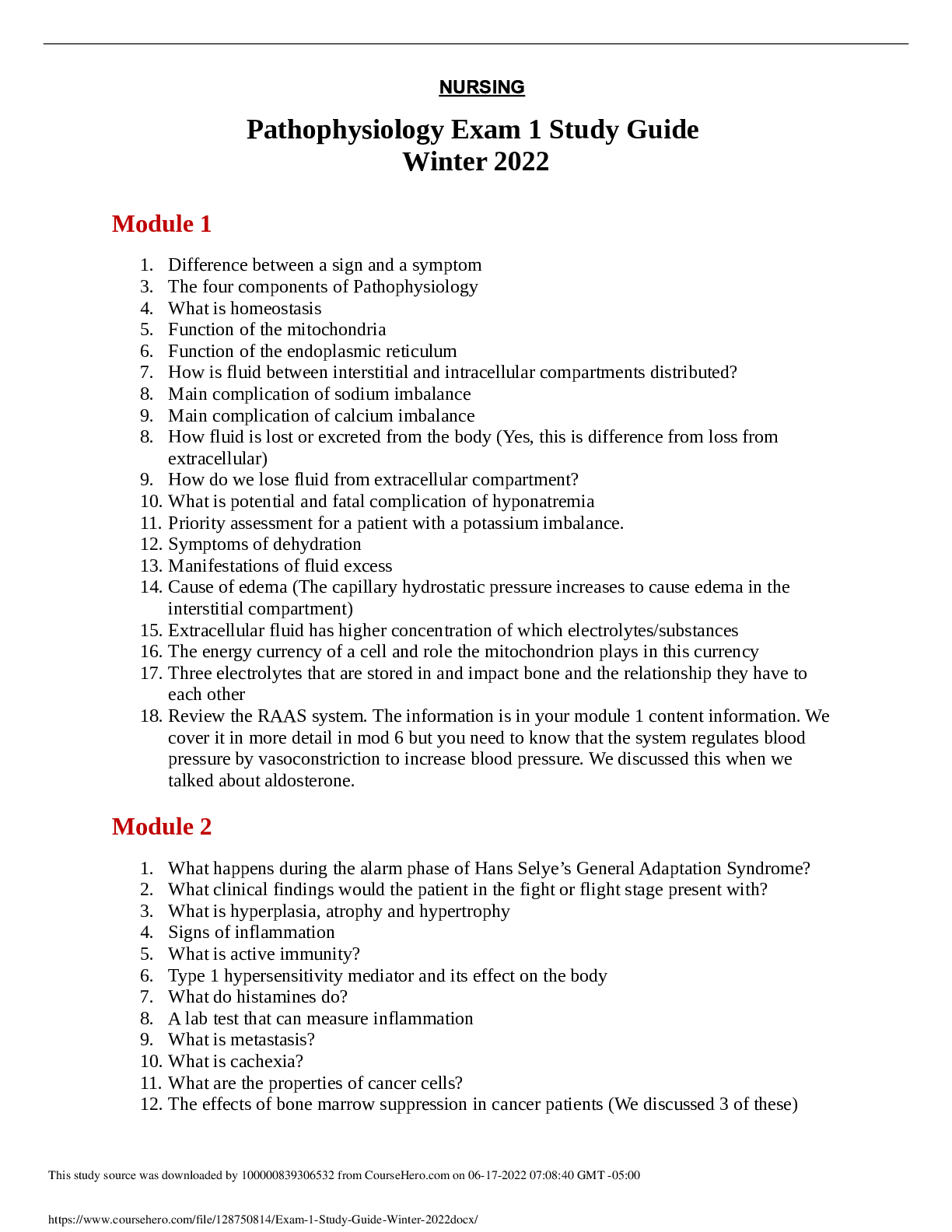 Pathophysiology > EXAM > Pathophysiology Exam 1 Study Guide Winter 2022 (All)