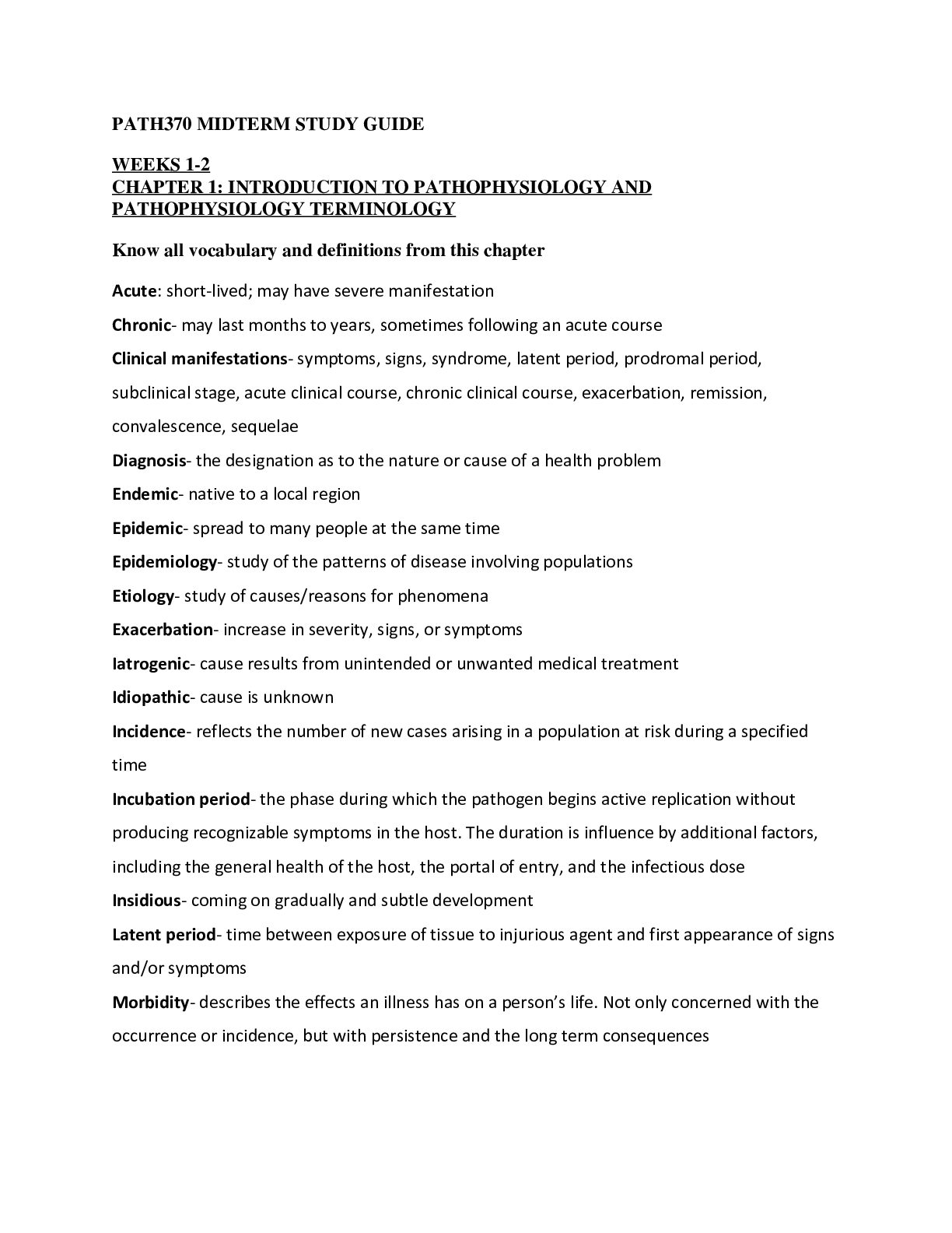 Pathophysiology > STUDY GUIDE > PATHO 370 MIDTERM EXAM STUDY GUIDE (All)