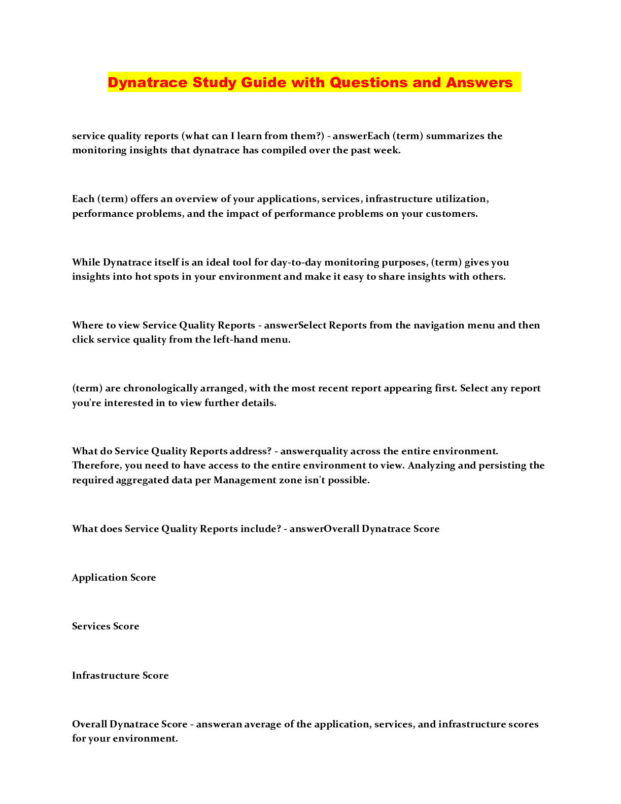 Information Technology > QUESTIONS & ANSWERS > Dynatrace Study Guide with Questions and Answers (All)