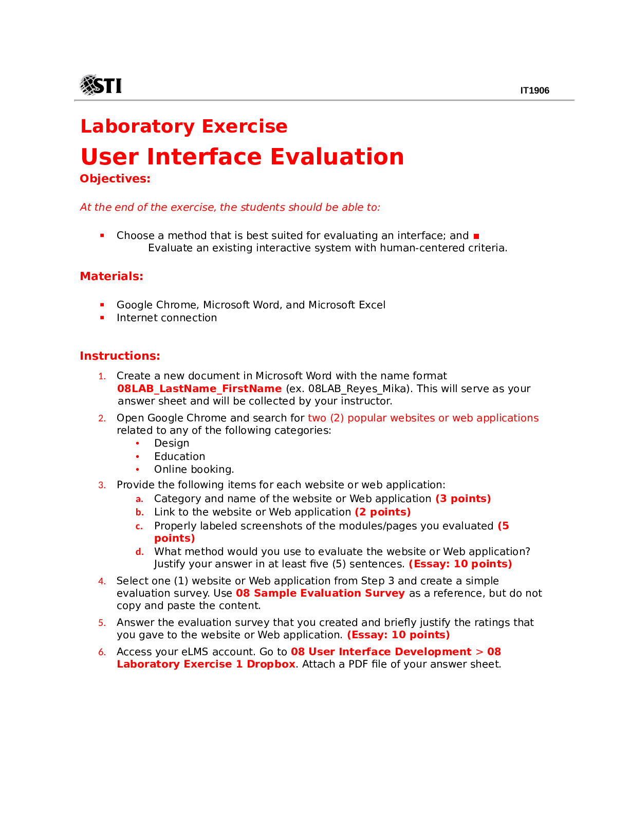Information Technology > QUESTIONS & ANSWERS > Lab Experiment > 8_Laboratory_Exercise_1 Laboratory Exercise User Interface Evaluation. (All)