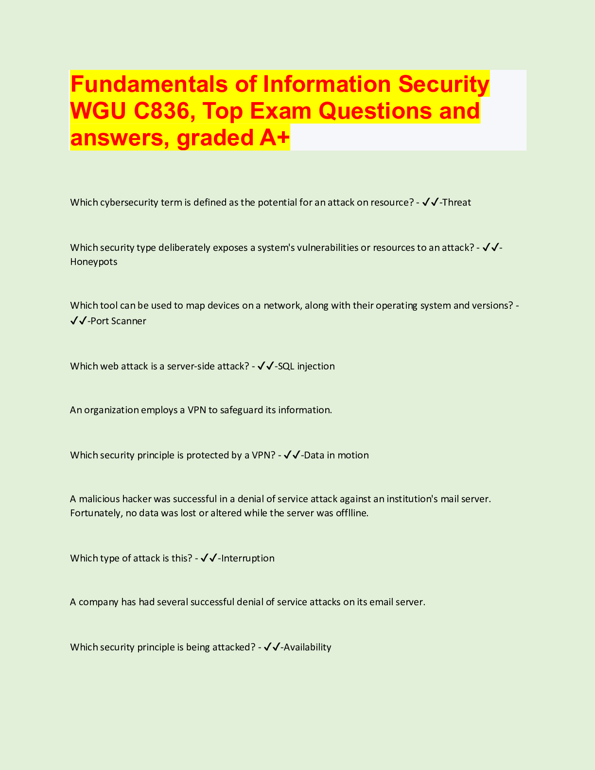 Information Technology > QUESTIONS & ANSWERS > Fundamentals of Information Security WGU C836, Top Exam Questions and answers, graded A+ (All)