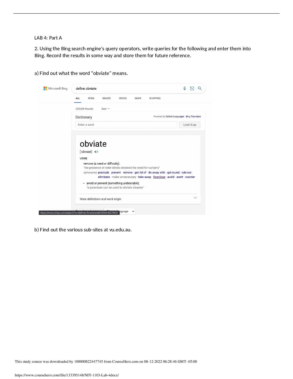 Information Technology > QUESTIONS & ANSWERS > Victoria UniversityNIT 1103NIT 1103 - Lab 4 A . Using the Bing search engine's query operators, write queries for the following and enter them into Bing. Record the results in some way and store them for future reference. (All)