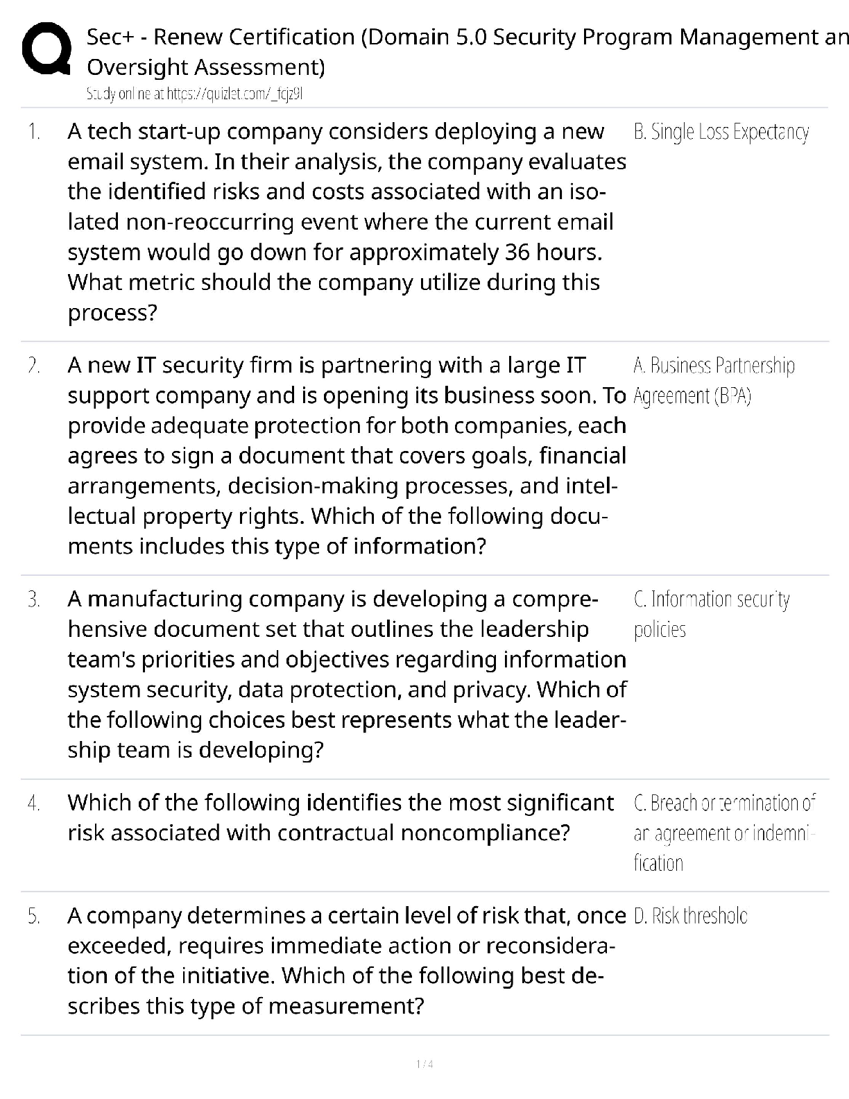 Information Technology > QUESTIONS & ANSWERS > Security+ Renewal Exam / Domain 5.0 Study Guide 2025 / Security Program Management / CE Prep & Practice Test (All)