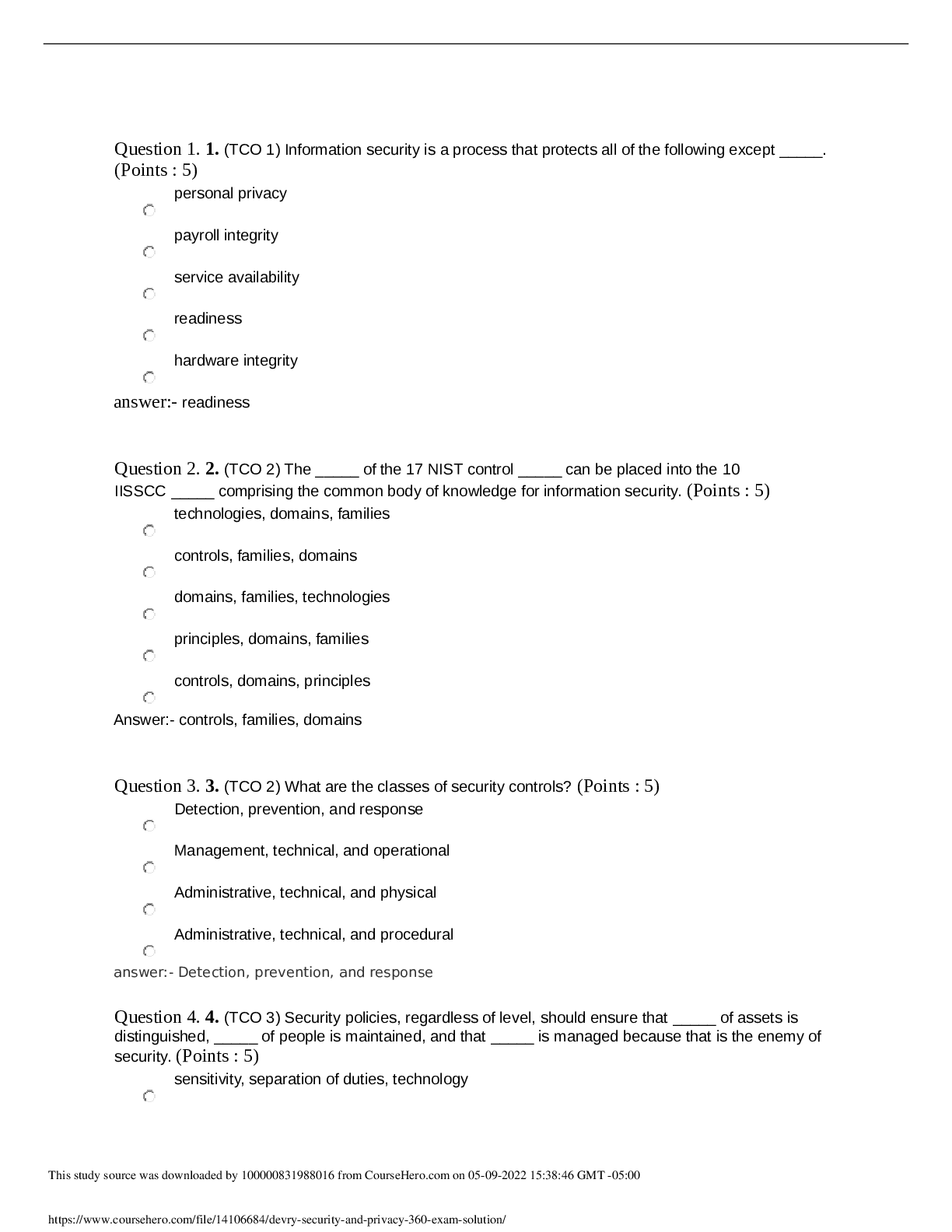 Information Technology > QUESTIONS & ANSWERS > 280 - Week 1 Quiz Principles of information Systems Security (SOLVED) (All)