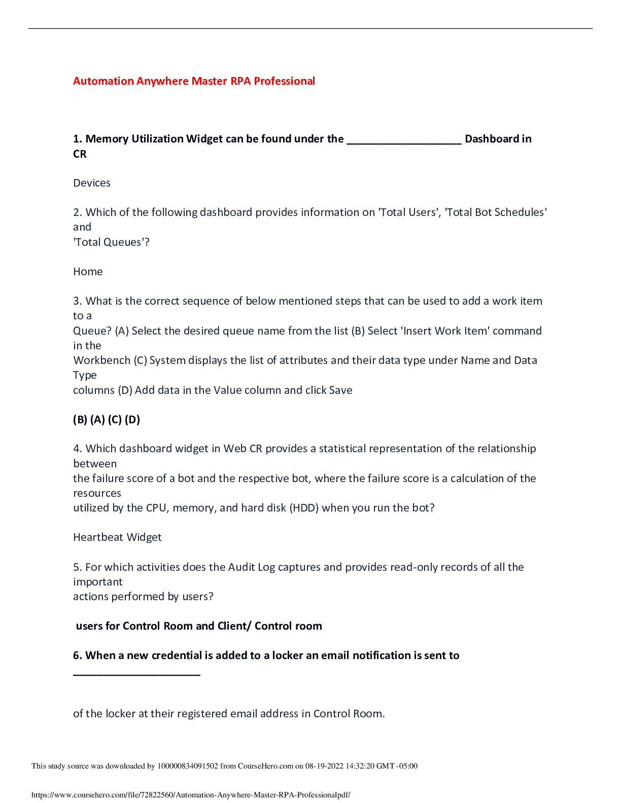 Information Technology > QUESTIONS & ANSWERS > FULL AUTOMATION ANYWHERE RPA CERTIFICATION QUIZ AND IMPORTANT MCQS WITH ANSWERS DUMPS. All Possible questions in 416 Pages (All)