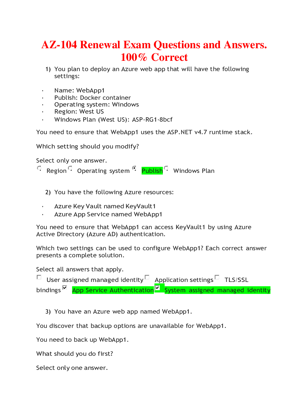 Information Technology > QUESTIONS & ANSWERS > AZ-104 Renewal Exam Questions and Answers. 100% Correct (All)