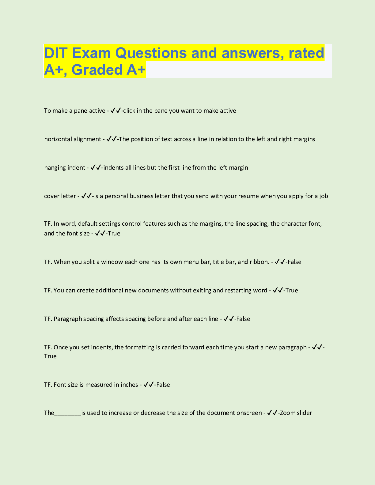 Information Technology > QUESTIONS & ANSWERS > DIT Exam Questions and answers, rated A+, Graded A+ (All)