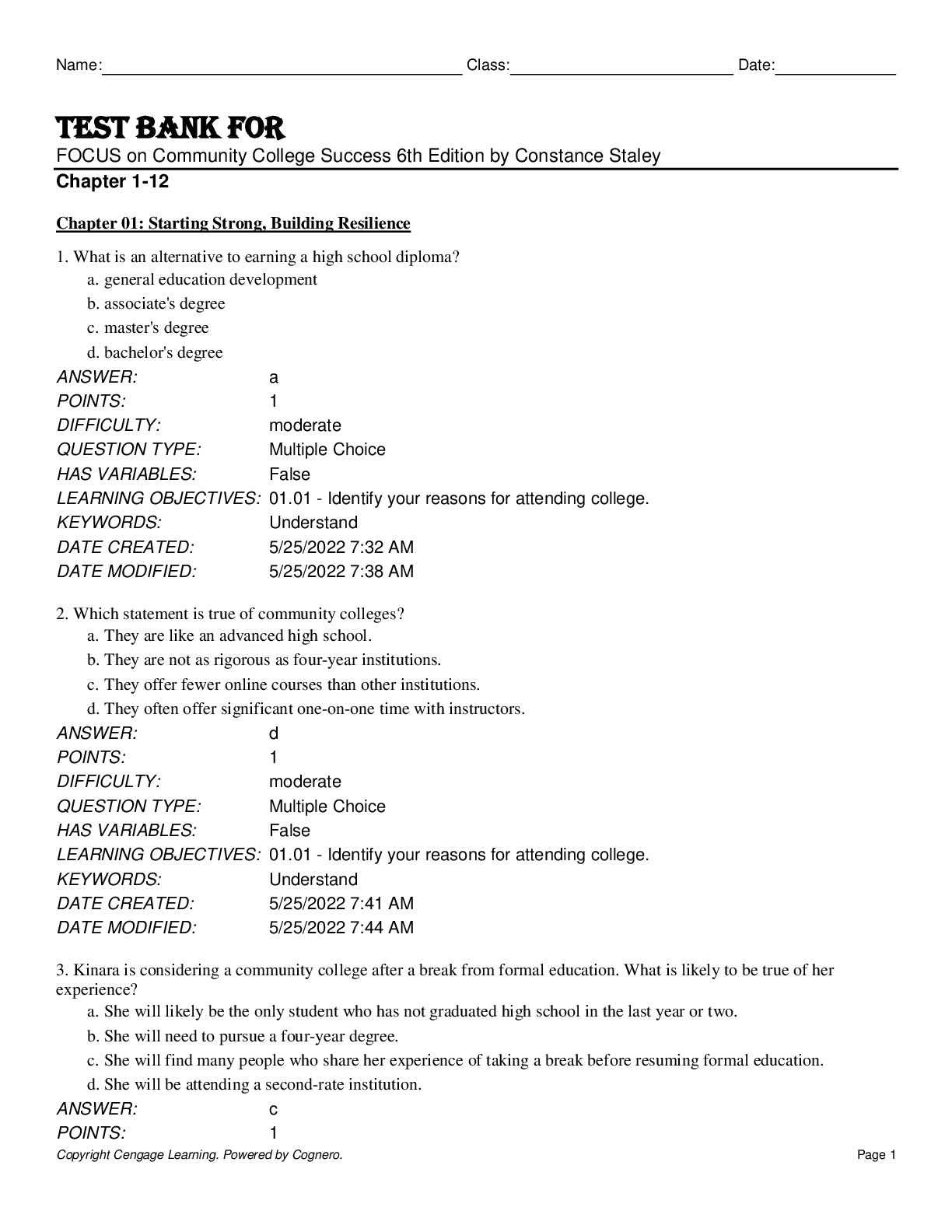 Communication > TEST BANKS > Test Bank For FOCUS on Community College Success 6th Edition by Constance Staley Chapter 1-12 (All)