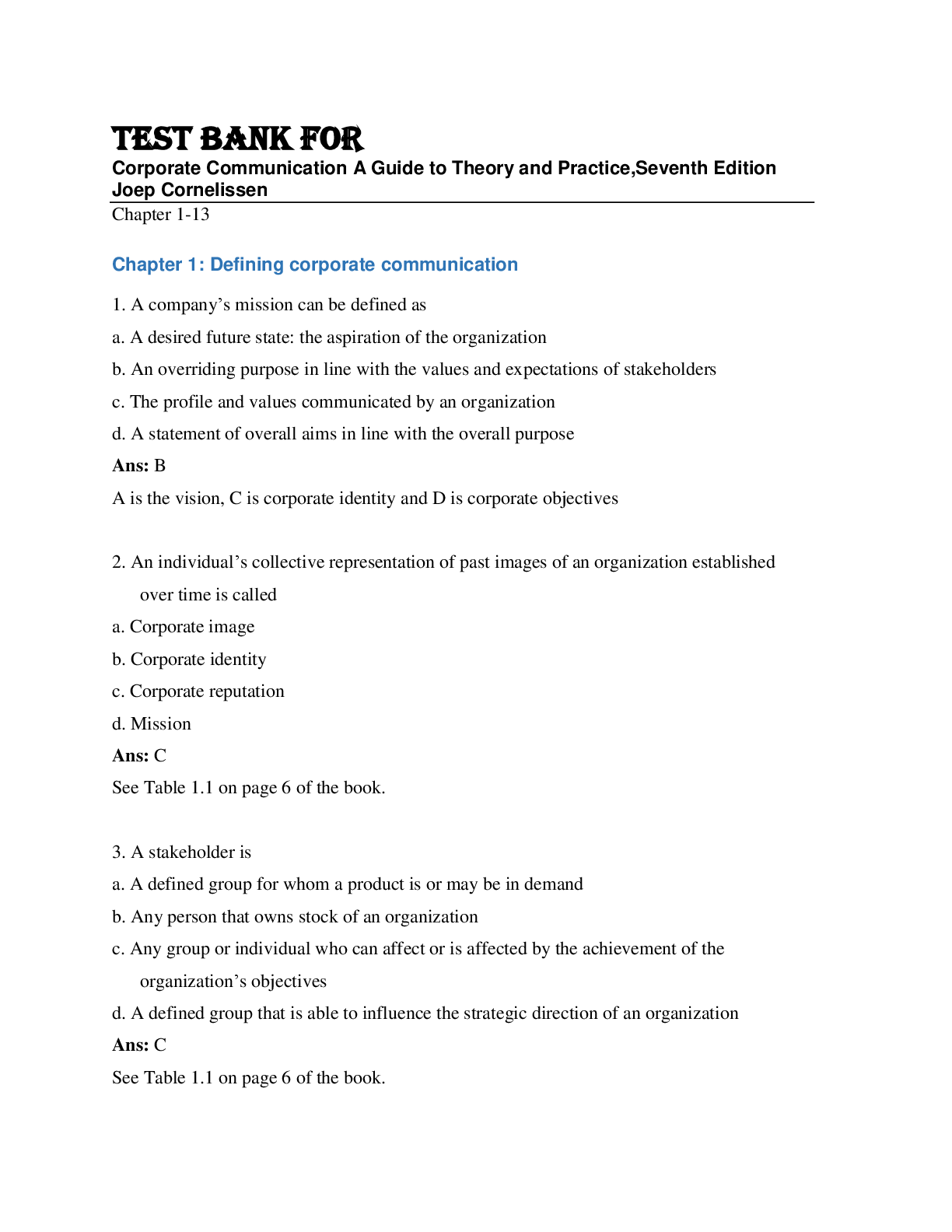 Communication > TEST BANKS > Test Bank For Corporate Communication A Guide to Theory and Practice,Seventh Edition By Joep Cornelissen (All)