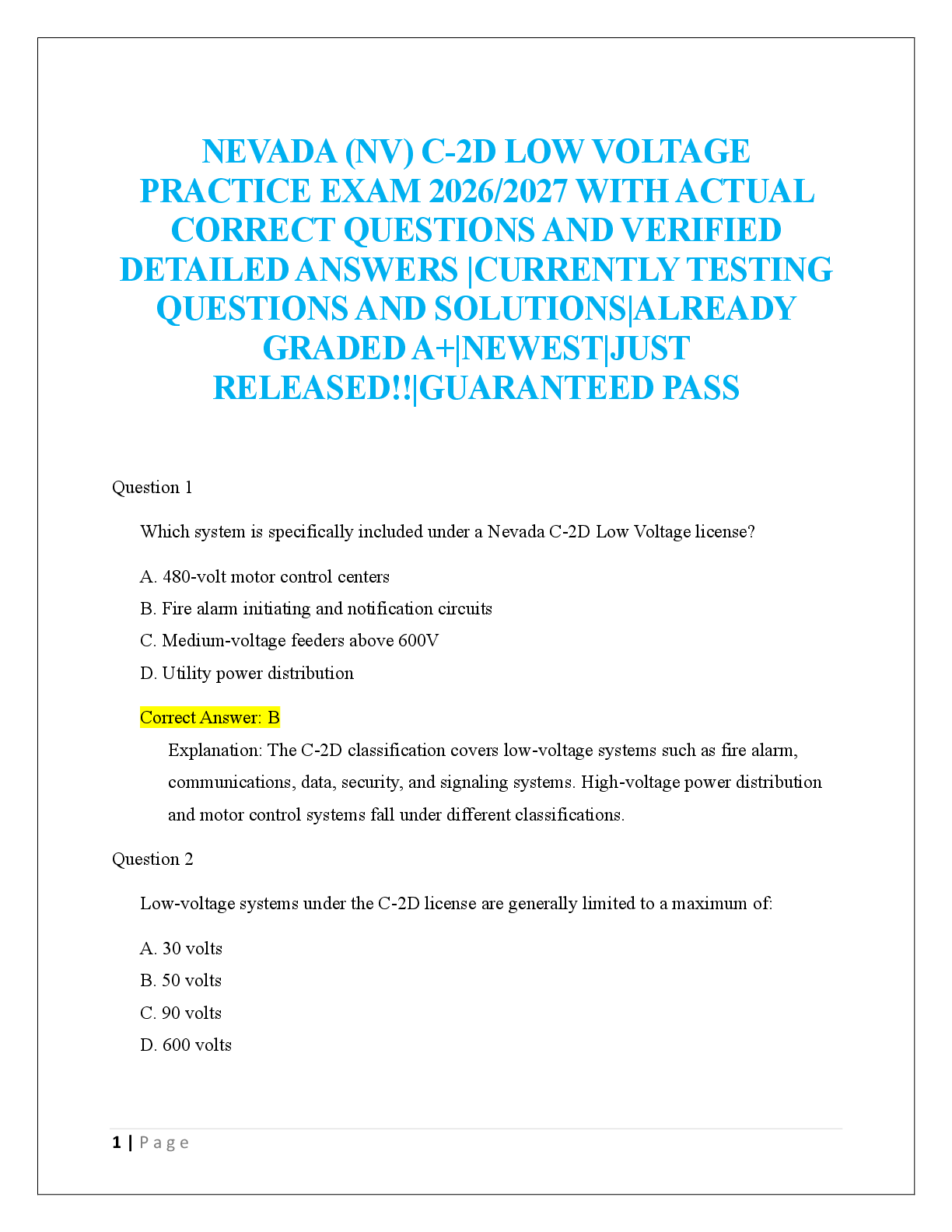Communication > EXAM > NEVADA (NV) C-2D LOW VOLTAGE PRACTICE EXAM 2026/2027 (All)