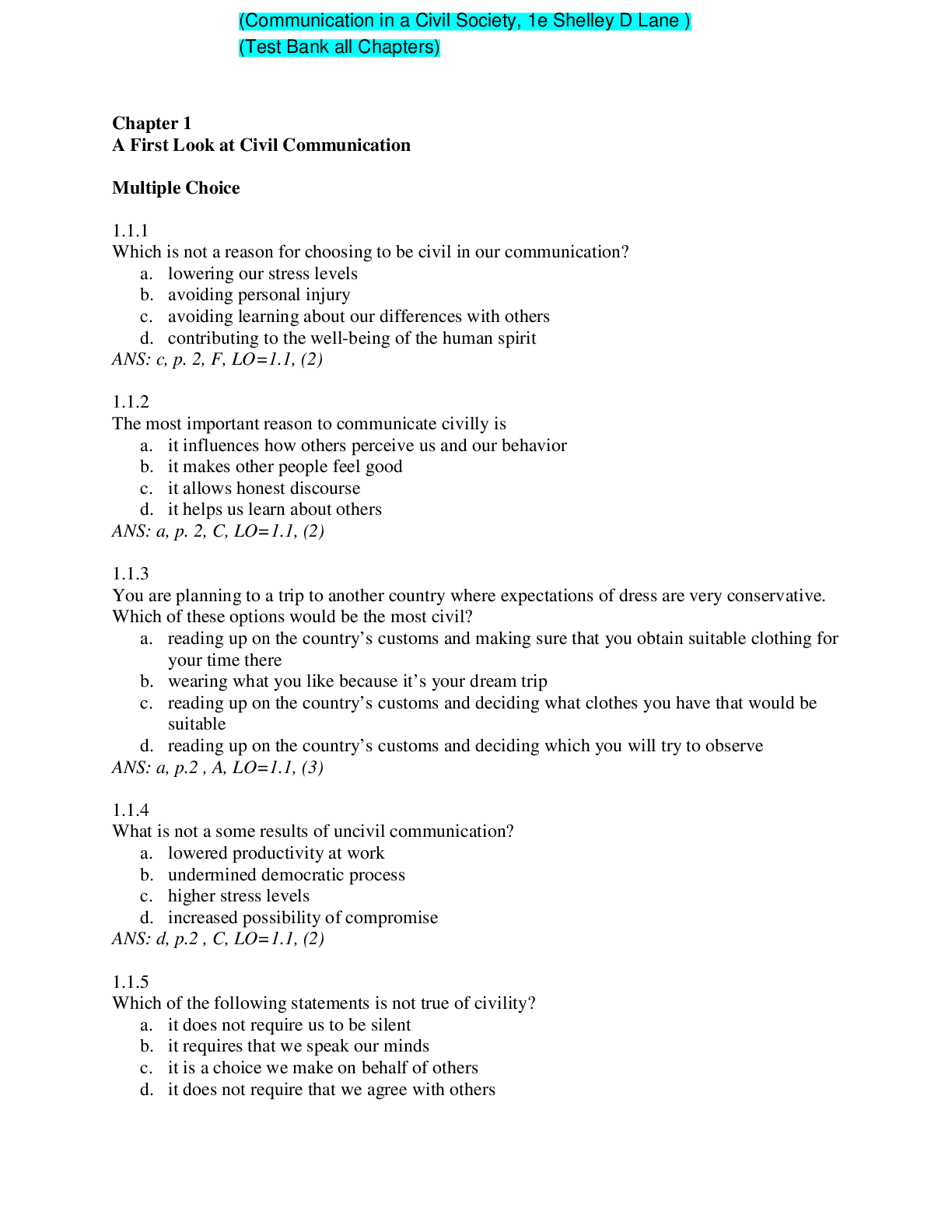 Communication > TEST BANKS > Test Bank for Communication in a Civil Society 1st Edition by Shelley D Lane (All)
