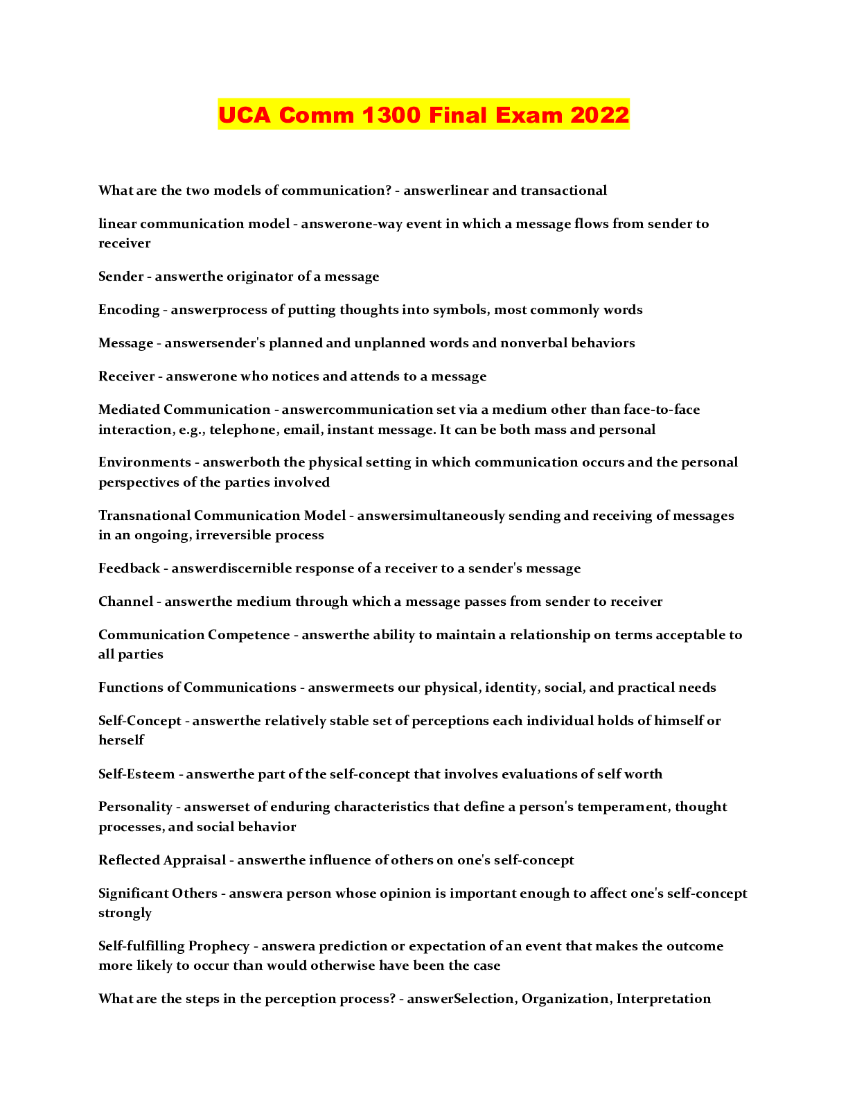 Communication > QUESTIONS & ANSWERS > UCA Comm 1300 Final Exam 2022 (All)
