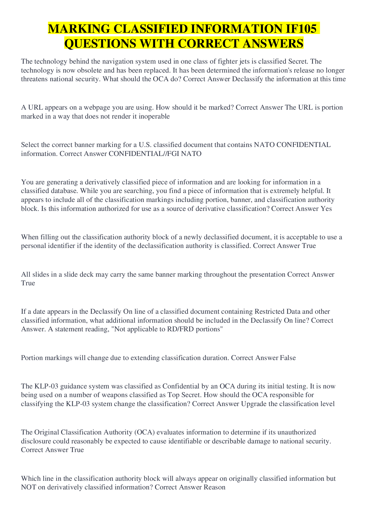 Communication > QUESTIONS & ANSWERS > MARKING CLASSIFIED INFORMATION IF105 QUESTIONS WITH CORRECT ANSWERS (All)