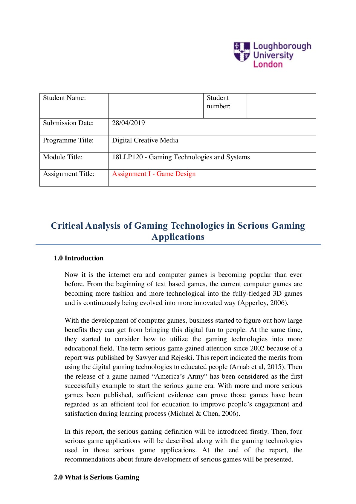 Communication > ESSAY > Critical Analysis of Gaming Technologies in Serious Gaming Applications (All)