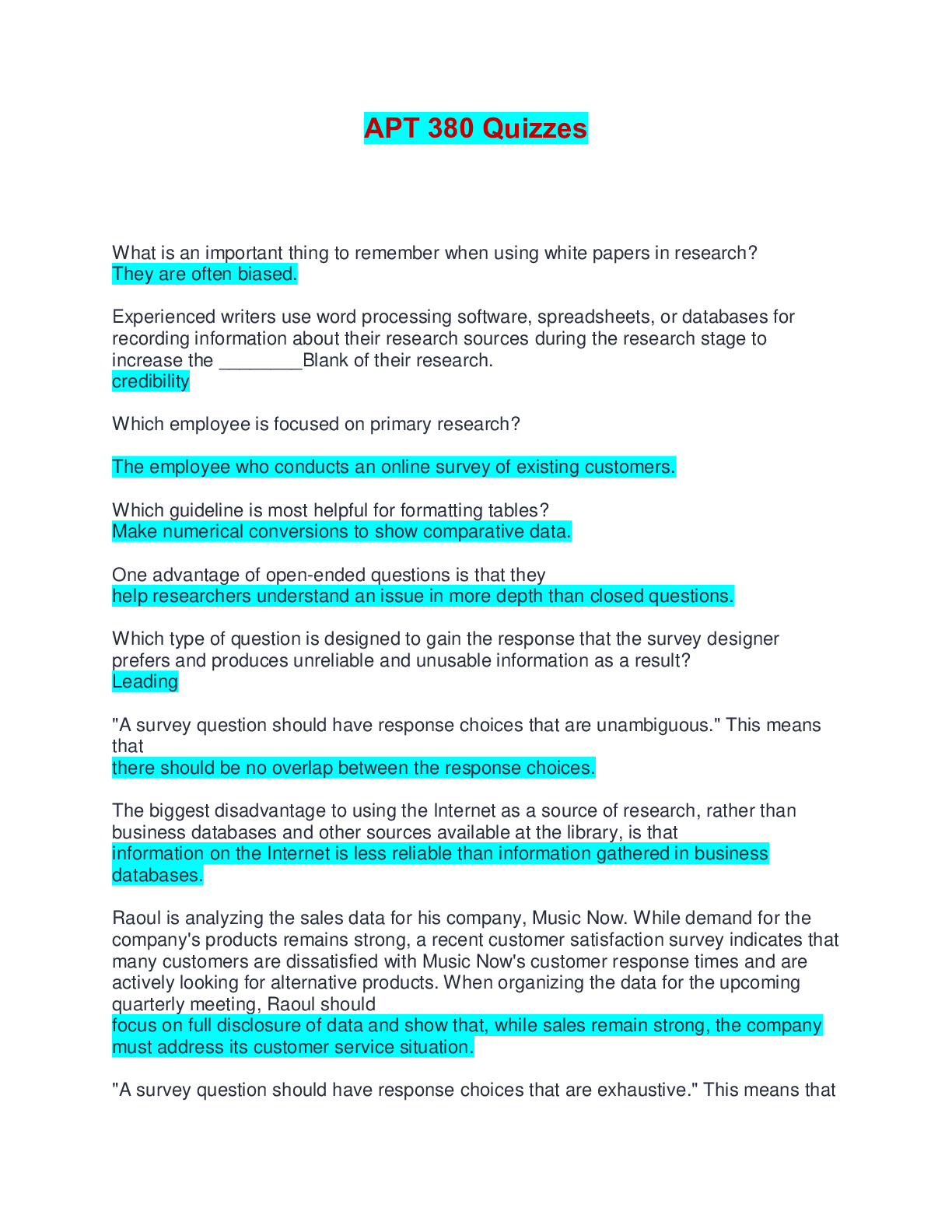 Communication > EXAM > APT 380 Quizzes | Questions and Answers (All)