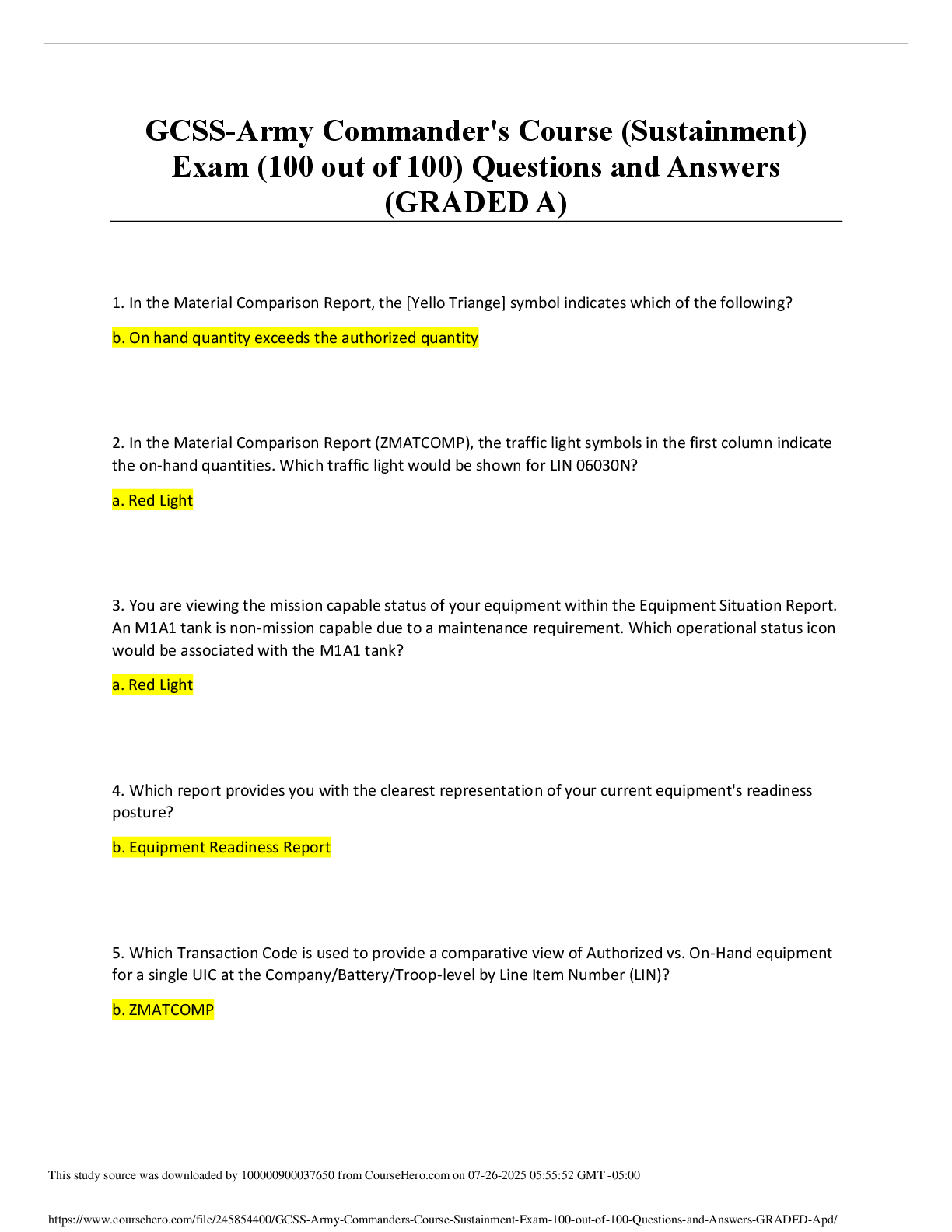 Military Studies > EXAM > GCSS-Army Commander's Course (Sustainment) Exam (100 out of 100) Questions and Answers | Graded A (All)