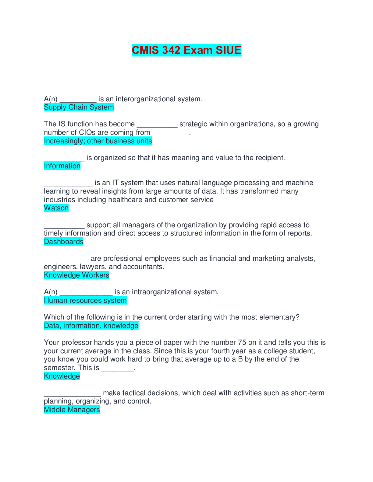 Management Information Systems (MIS) > EXAM > CMIS 342 Exam SIUE | Questions with 100% Correct Answers (All)