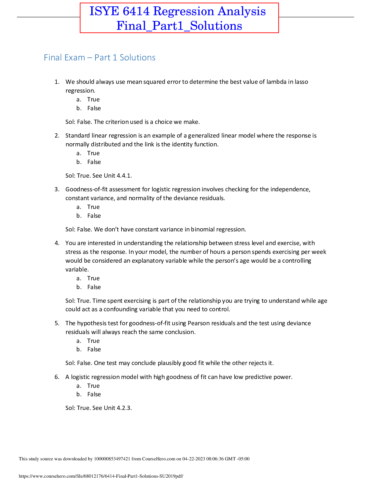 Computer Science > QUESTIONS & ANSWERS > ISYE 6414 Regression Analysis Final_Part1_Solutions: Georgia Institute Of Technology (All)