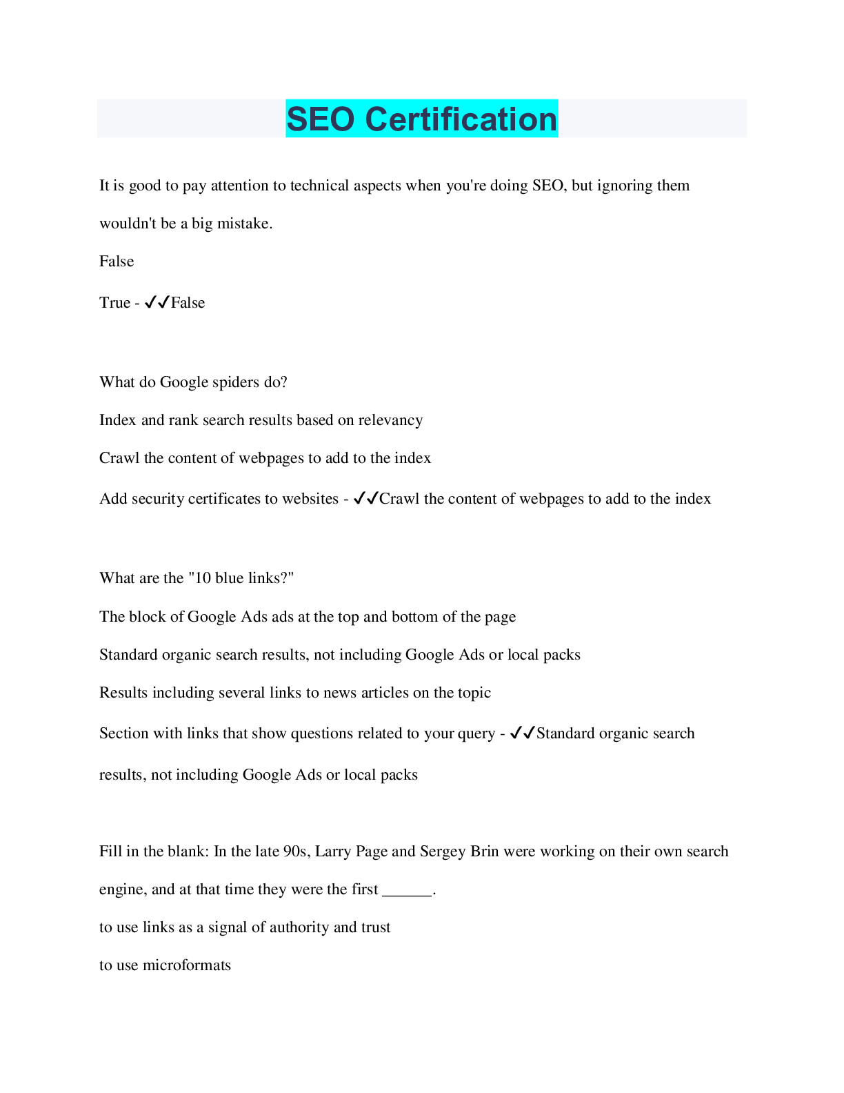 Computer Science > QUESTIONS & ANSWERS > SEO Certification (All)