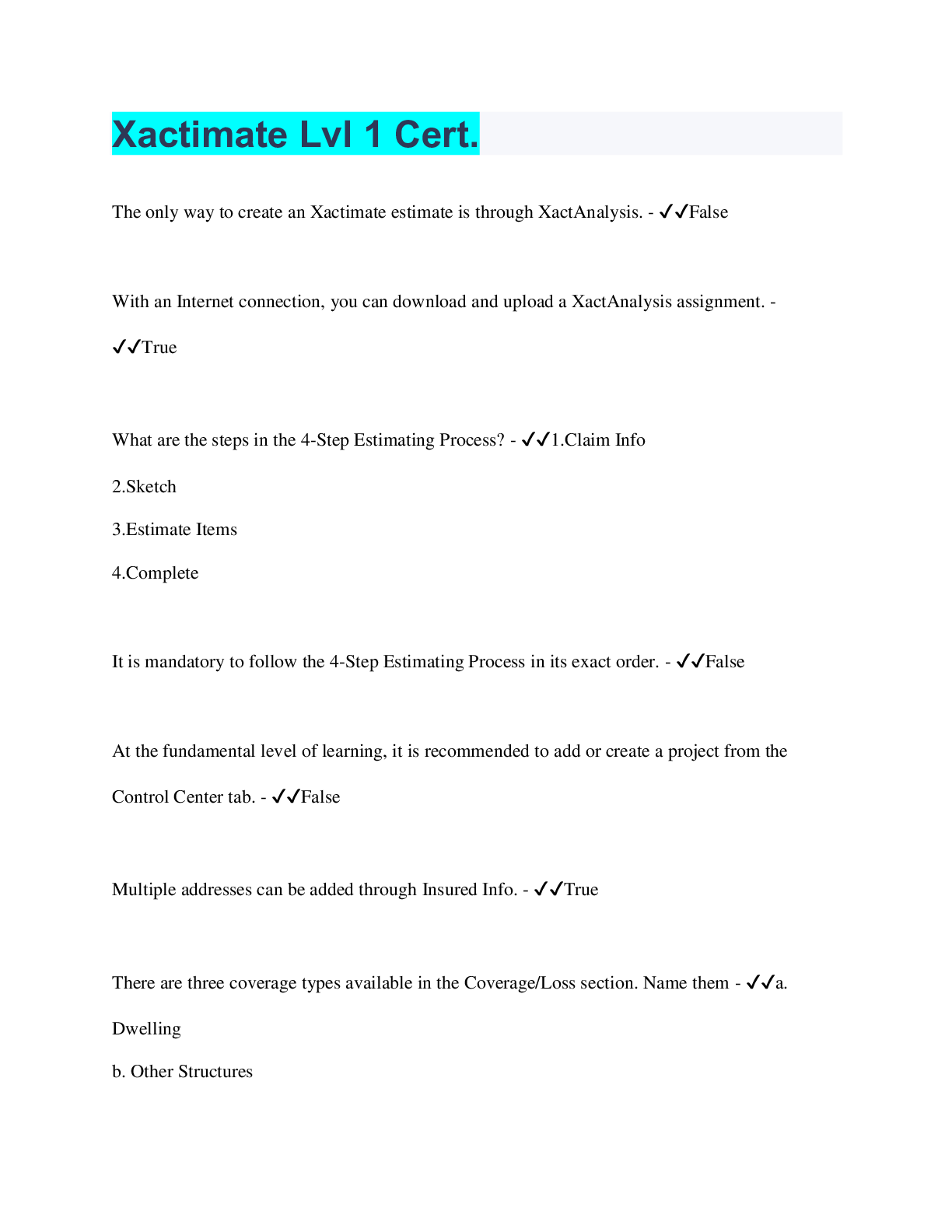 Computer Science > QUESTIONS & ANSWERS > Xactimate Lvl 1 Cert. (All)