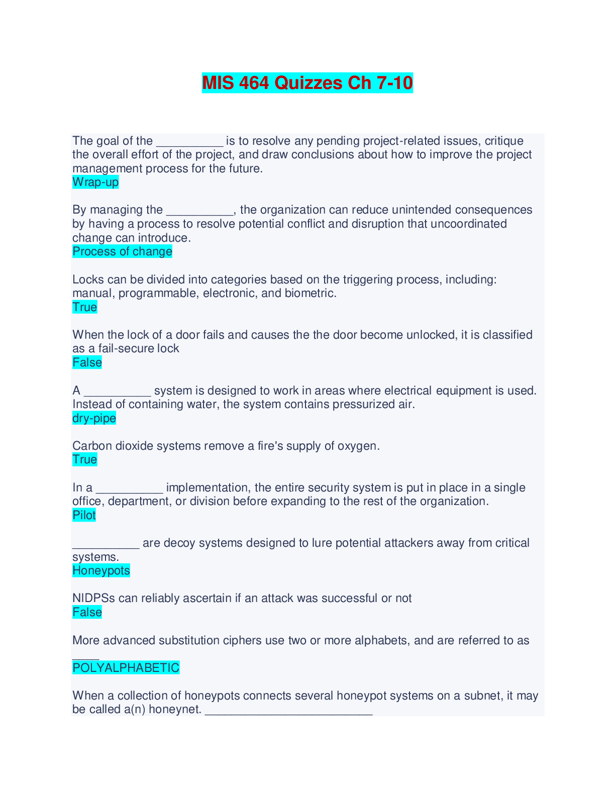 Computer Science > EXAMs > MIS 464 Quizzes Ch 7-10 with Verified Answers (All)