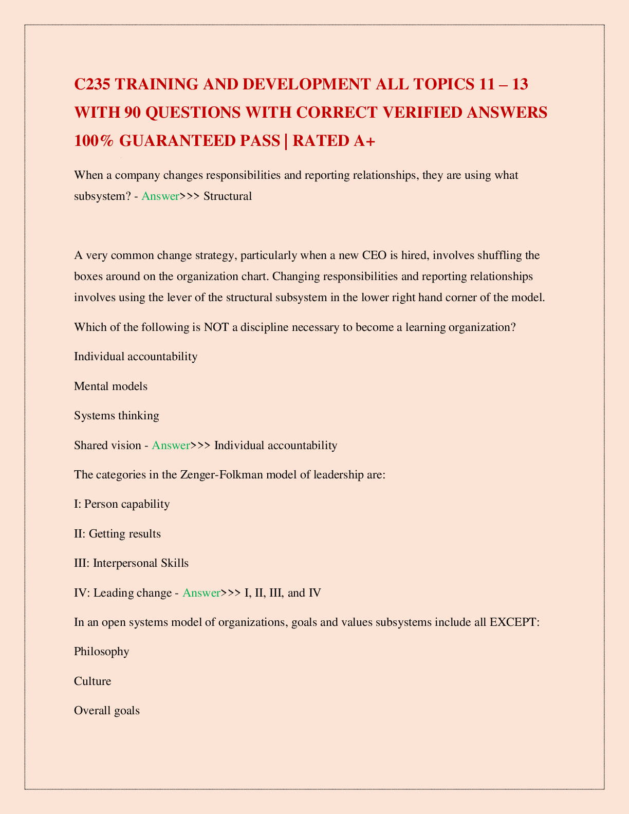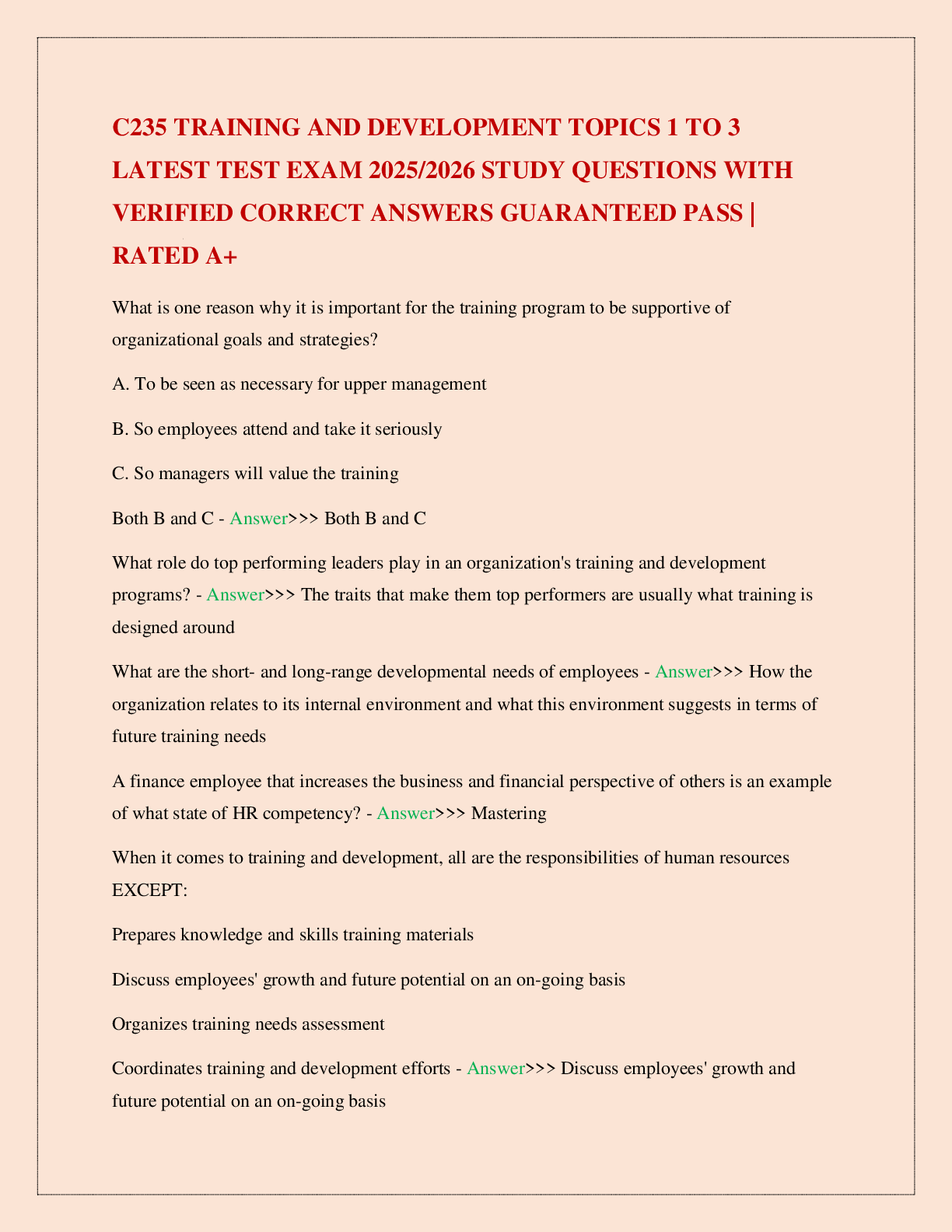 Computer Science > EXAM > C235 TRAINING AND DEVELOPMENT TOPICS 1 TO 3 LATEST TEST EXAM 2025/2026 STUDY QUESTIONS WITH VERIFIED CORRECT ANSWERS GUARANTEED PASS | RATED A+ (All)