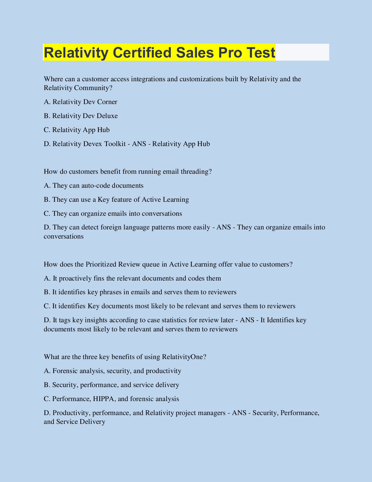 Computer Science > EXAM > Relativity Certified Sales Pro Test | 70 Questions with 100% Correct Answers | Verified | 17 Pages (All)