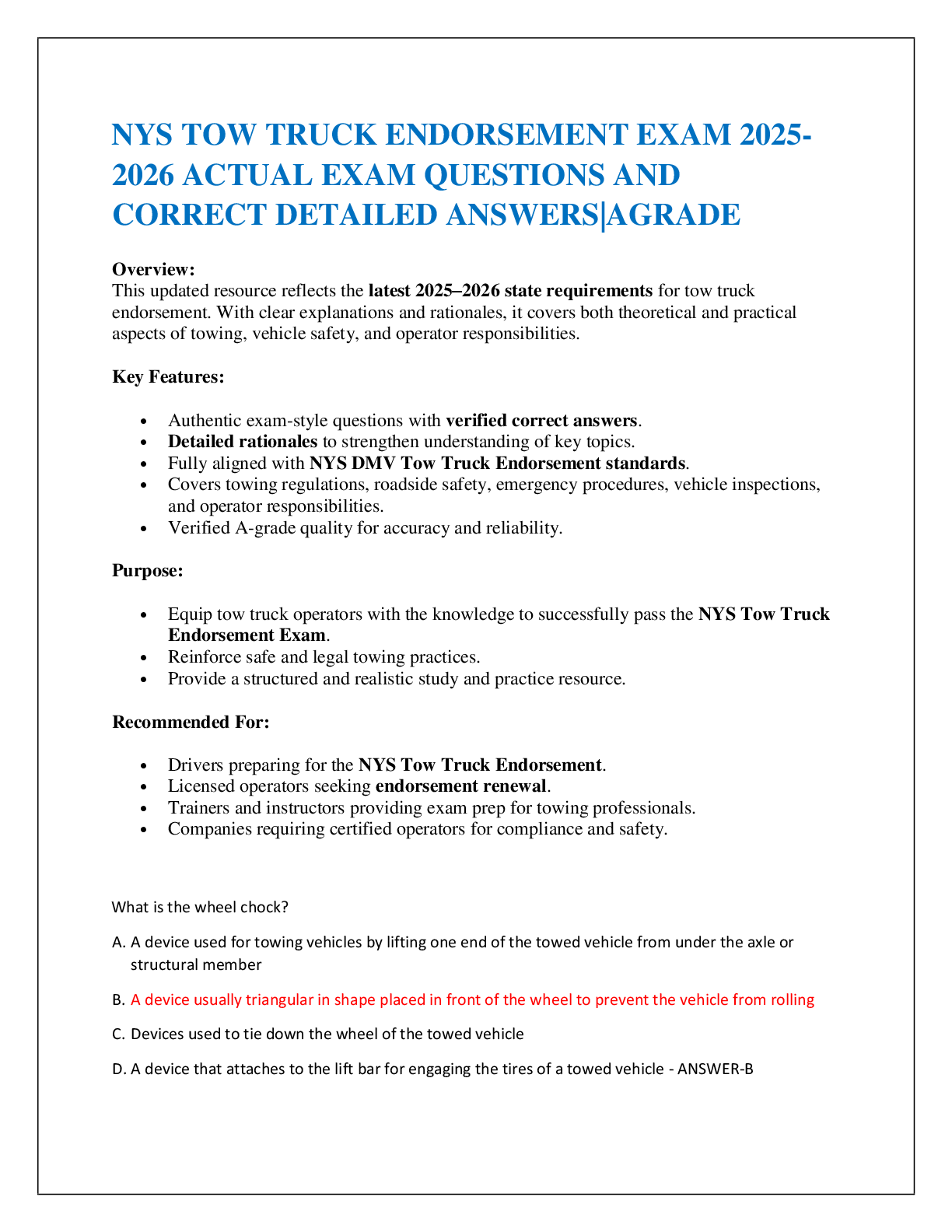 Engineering Mechanics > EXAM > NYS TOW TRUCK ENDORSEMENT EXAM 2025-2026 ACTUAL EXAM QUESTIONS AND CORRECT DETAILED ANSWERS|AGRADE (All)