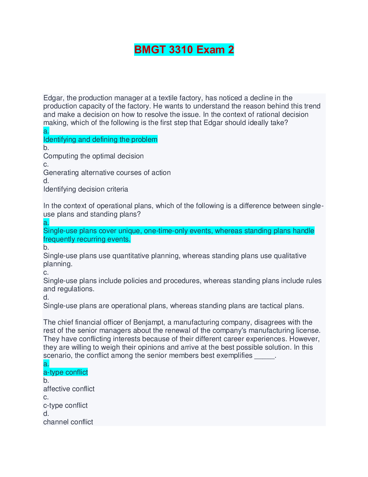 Business Management > EXAM > BMGT 3310 Exam 2 | Questions and Answers (Complete Solutions) (All)