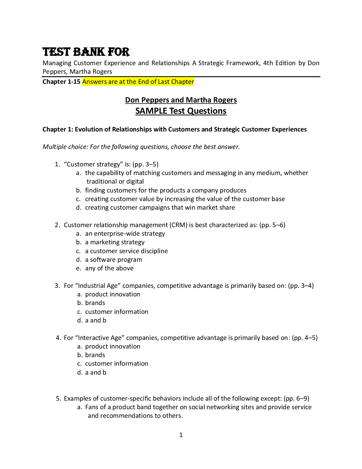Business Management > TEST BANKS > Test Bank For Managing Customer Experience and Relationships A Strategic Framework, 4th Edition by Don Peppers, Martha Rogers Chapter 1-15 A+ (All)