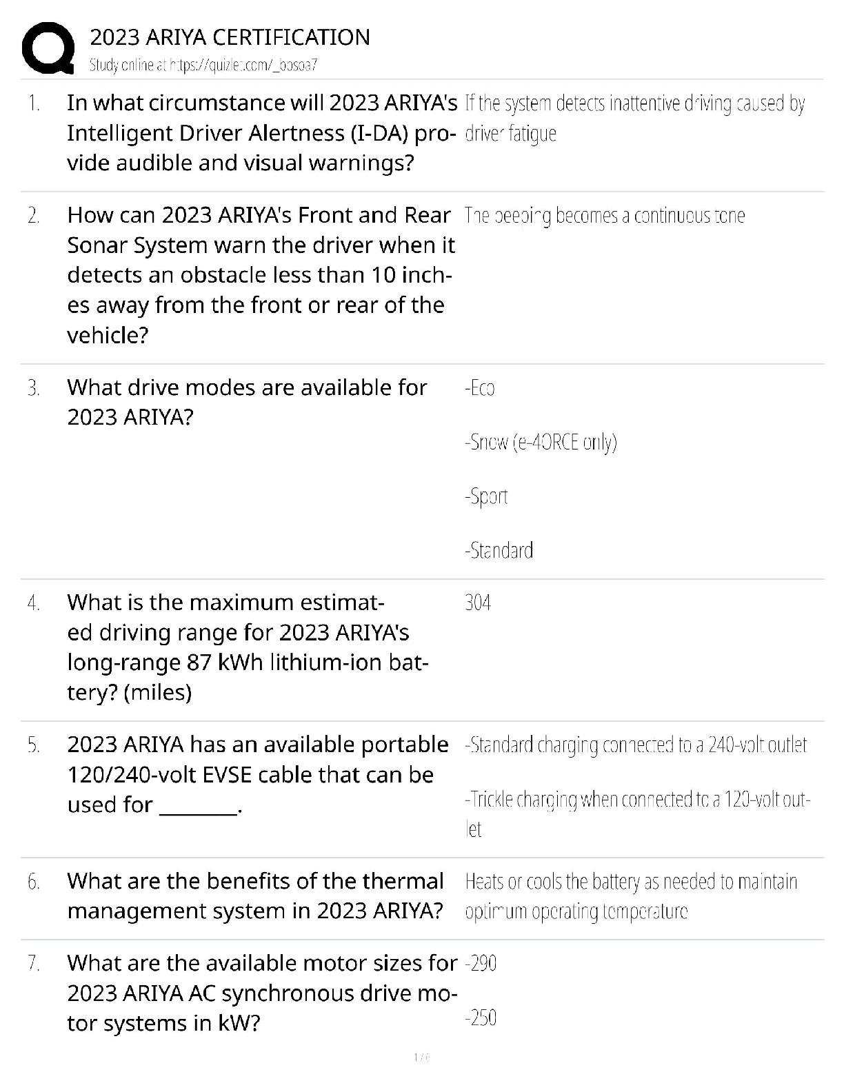 Business Management > QUESTIONS & ANSWERS > 2023 Ariya Certification / Nissan Electric Vehicle Exam / 2026 Update / Practice Test & Study Guide (All)