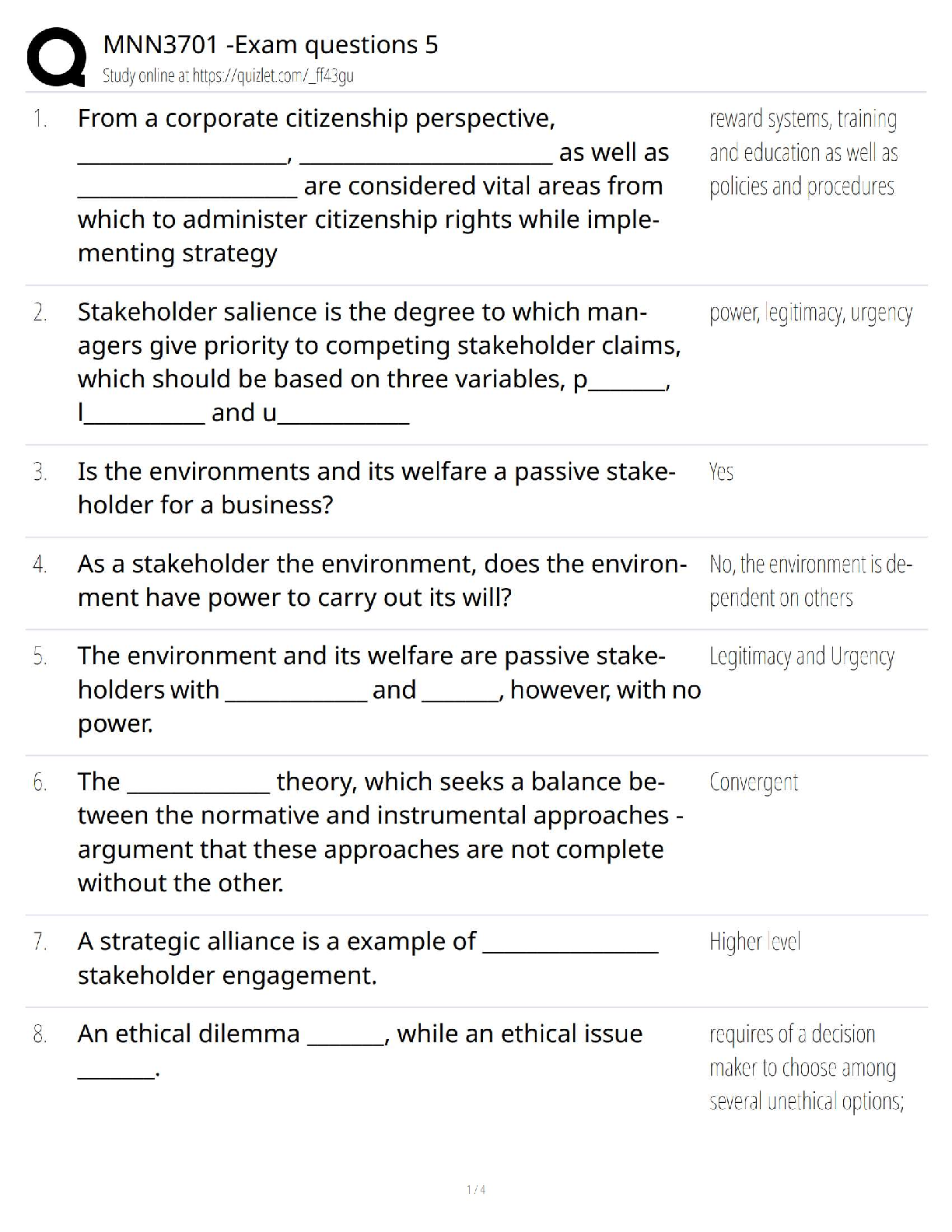 Business Management > QUESTIONS & ANSWERS > MNN3701 Exam Questions 5 / Corporate Citizenship / Stakeholder Theory & Q&A / 2025 Update (All)