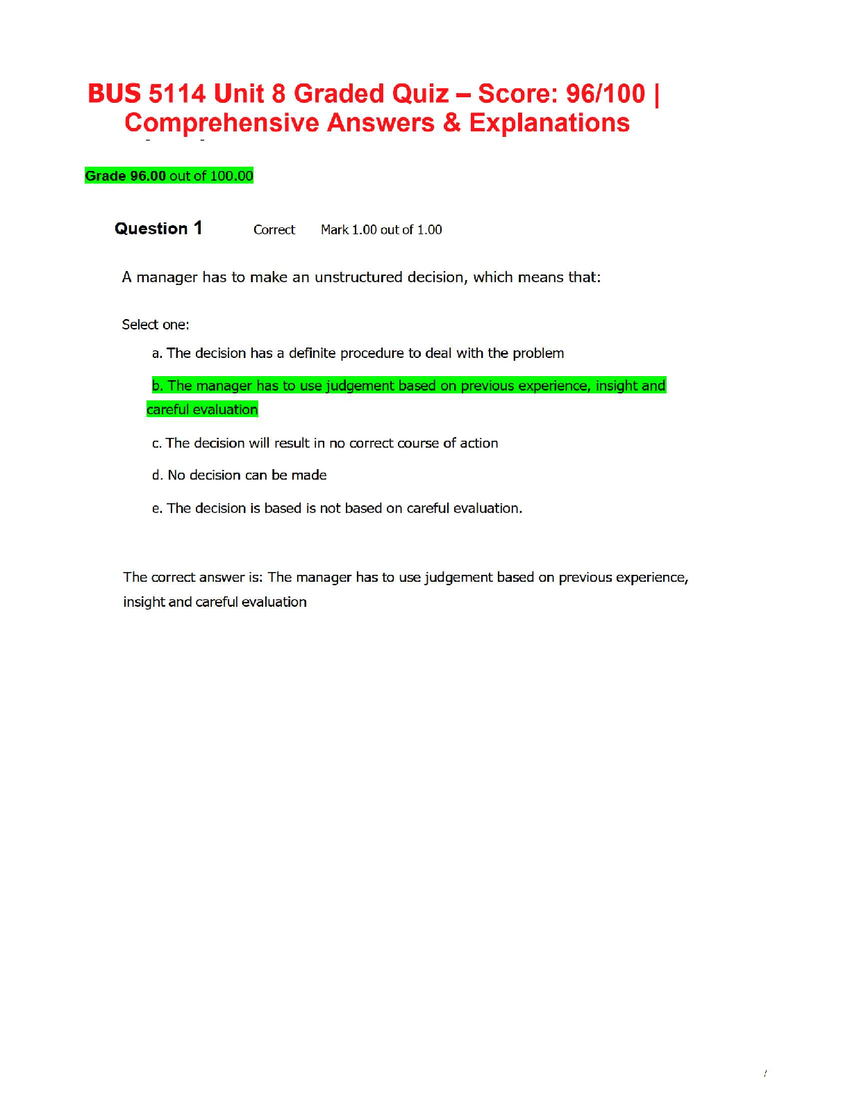 Business Management > Quiz > 📊 BUS 5114 Unit 8 Graded Quiz – Score: 96/100 | Comprehensive Answers & Explanations (All)