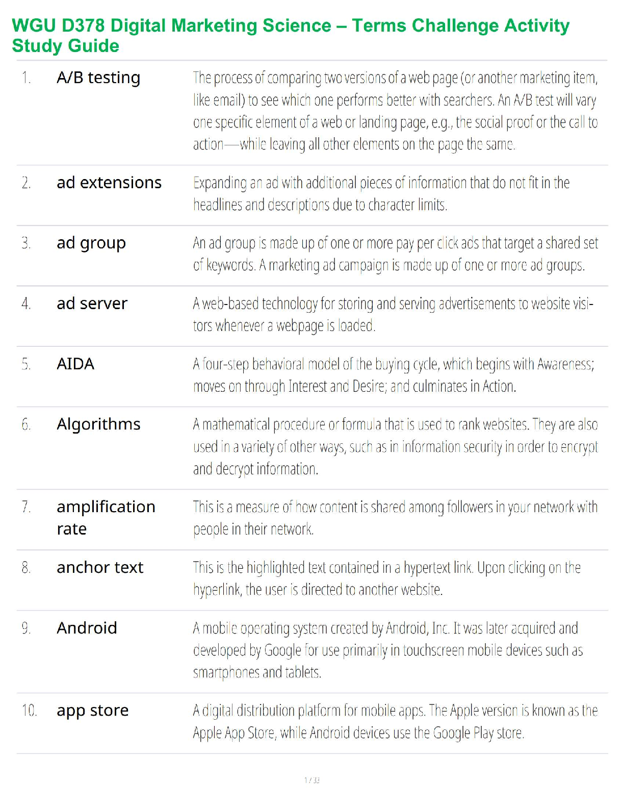 Business Management > STUDY GUIDE > WGU D378 Digital Marketing Science – Terms Challenge Activity Study Guide (All)