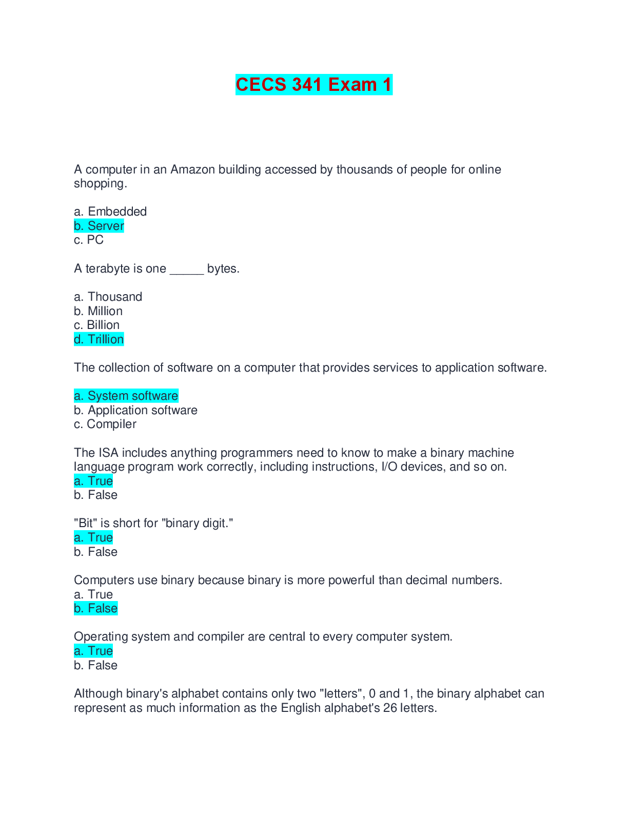 Computer Architecture > EXAM > CECS 341 Exam 1 | Questions with 100% Correct Answers (All)
