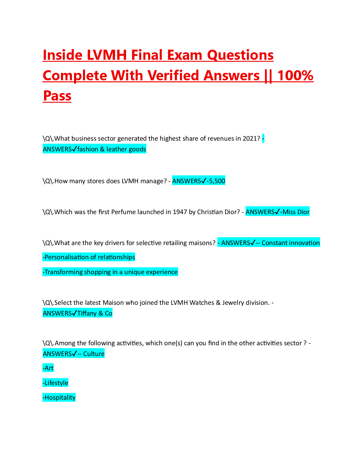 Logistics > A/As Level Mark Scheme > Inside LVMH Final Exam Questions Complete With Verified Answers || 100% Pass (All)