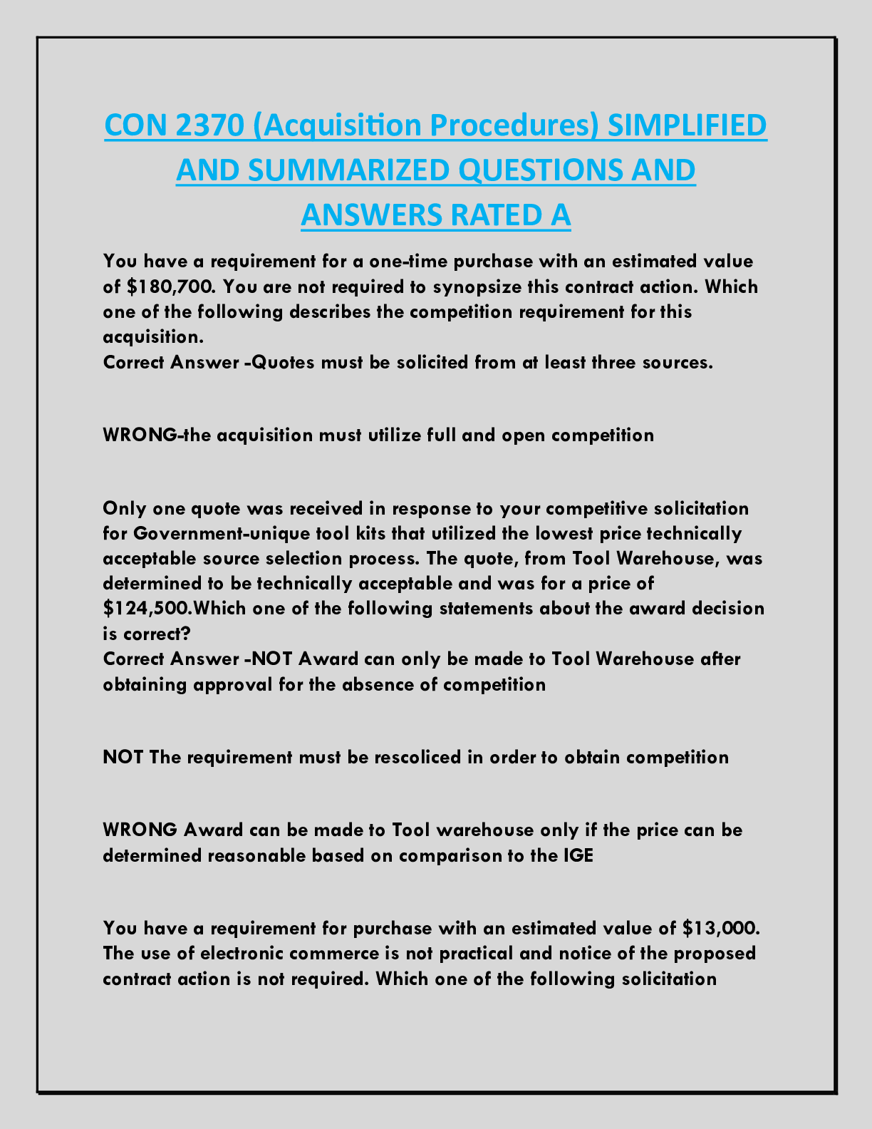Economics > EXAM > CON 2370 (Acquisition Procedures) SIMPLIFIED AND SUMMARIZED QUESTIONS AND ANSWERS RATED A (All)