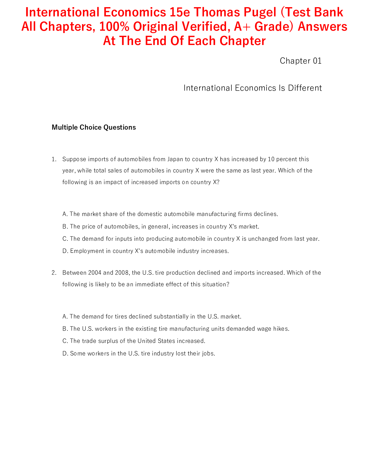 Economics > TEST BANKS > International Economics 15th Edition By Thomas Pugel (Test Bank All Chapters, 100% Original Verified, A+ Grade) (All)