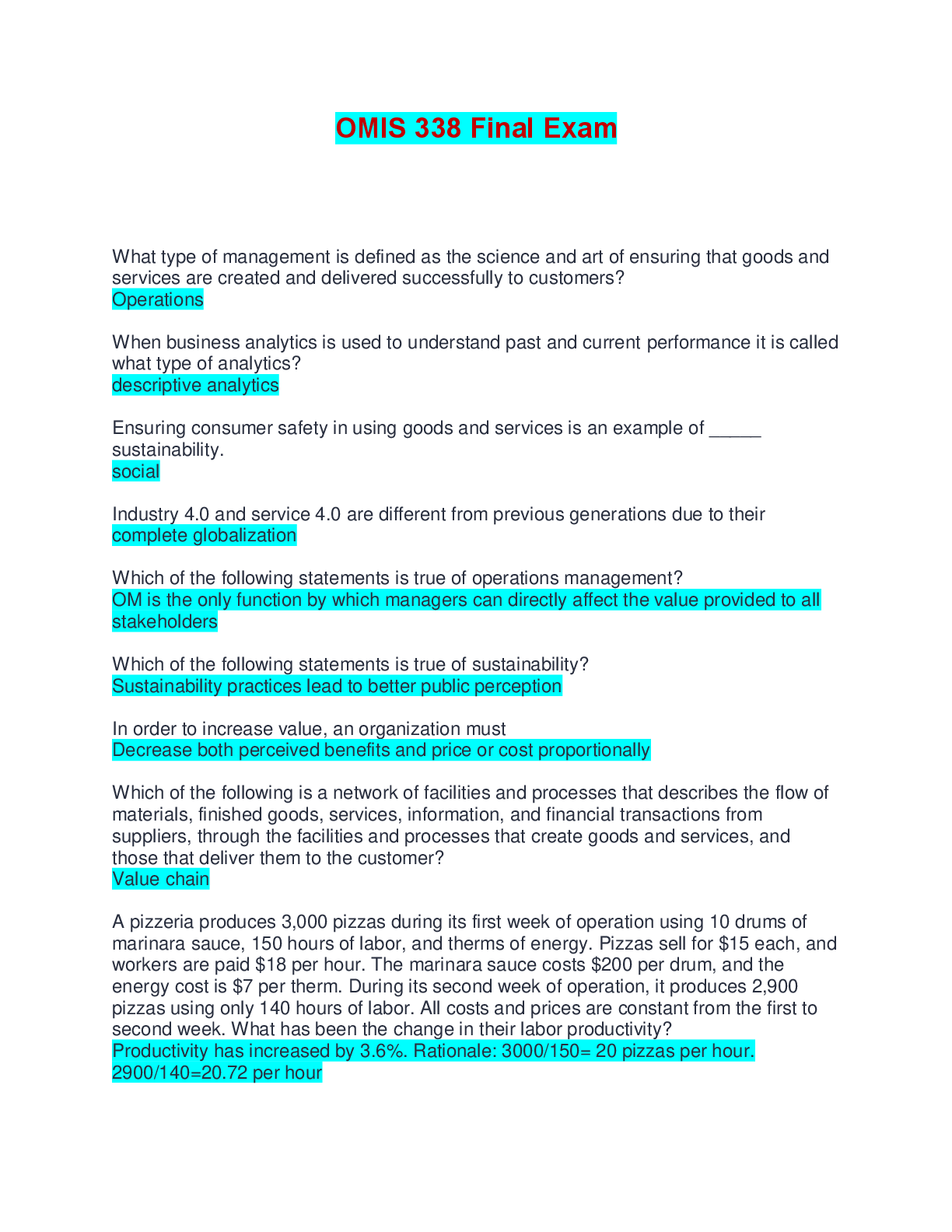 Operations Management > EXAM > OMIS 338 Final Exam | Questions and Answers (All)