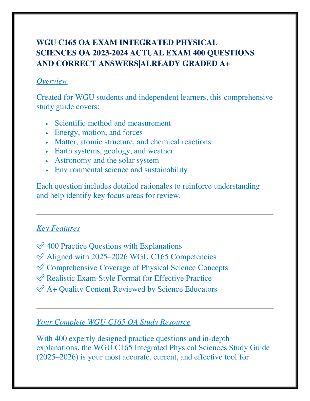 SCIENCE 101 > EXAM > WGU C165 OA EXAM INTEGRATED PHYSICAL SCIENCES OA 2023-2024 ACTUAL EXAM 400 QUESTIONS AND CORRECT ANSWERS|ALREADY GRADED A+ (All)