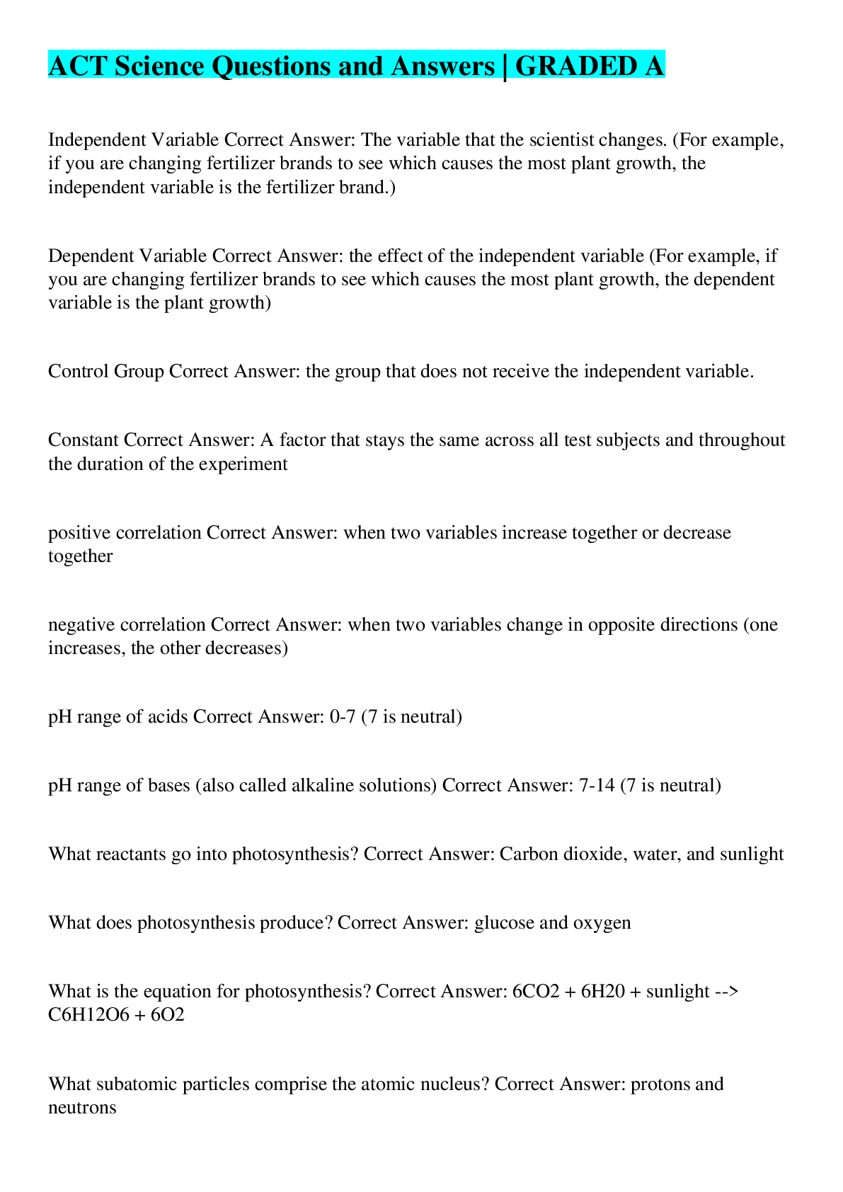 SCIENCE 101 > QUESTIONS & ANSWERS > ACT Science Review Questions and Answers 2022 (All)