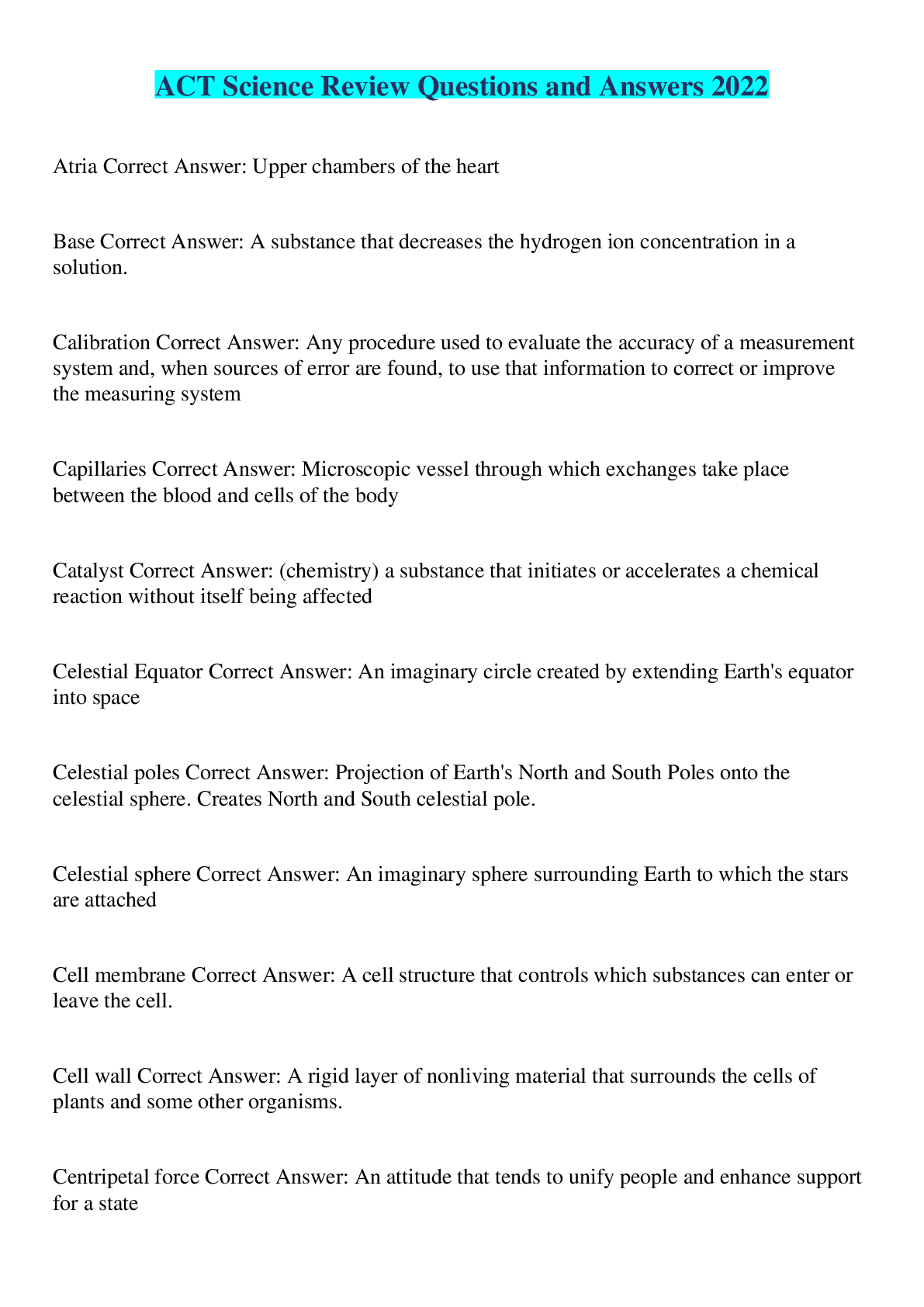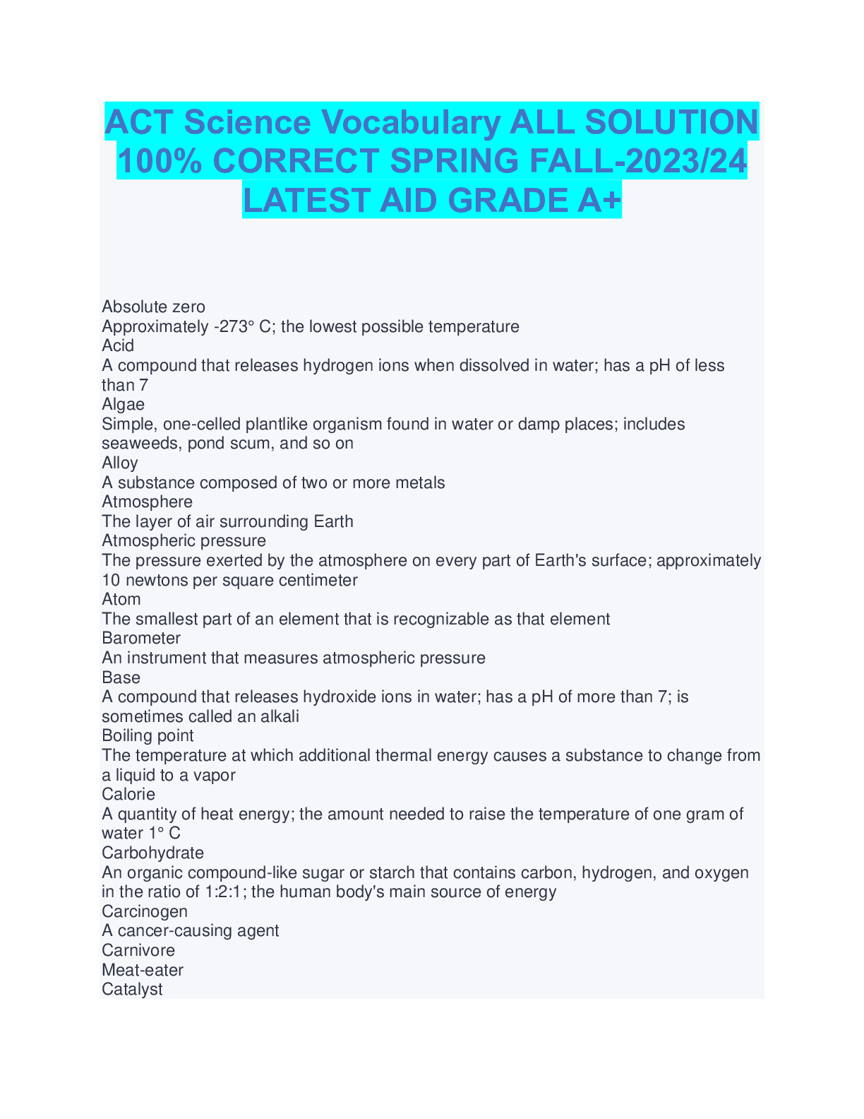 SCIENCE 101 > QUESTIONS & ANSWERS > ACT Science Vocabulary ALL SOLUTION 100% CORRECT SPRING FALL-2023/24 LATEST AID GRADE A+ (All)