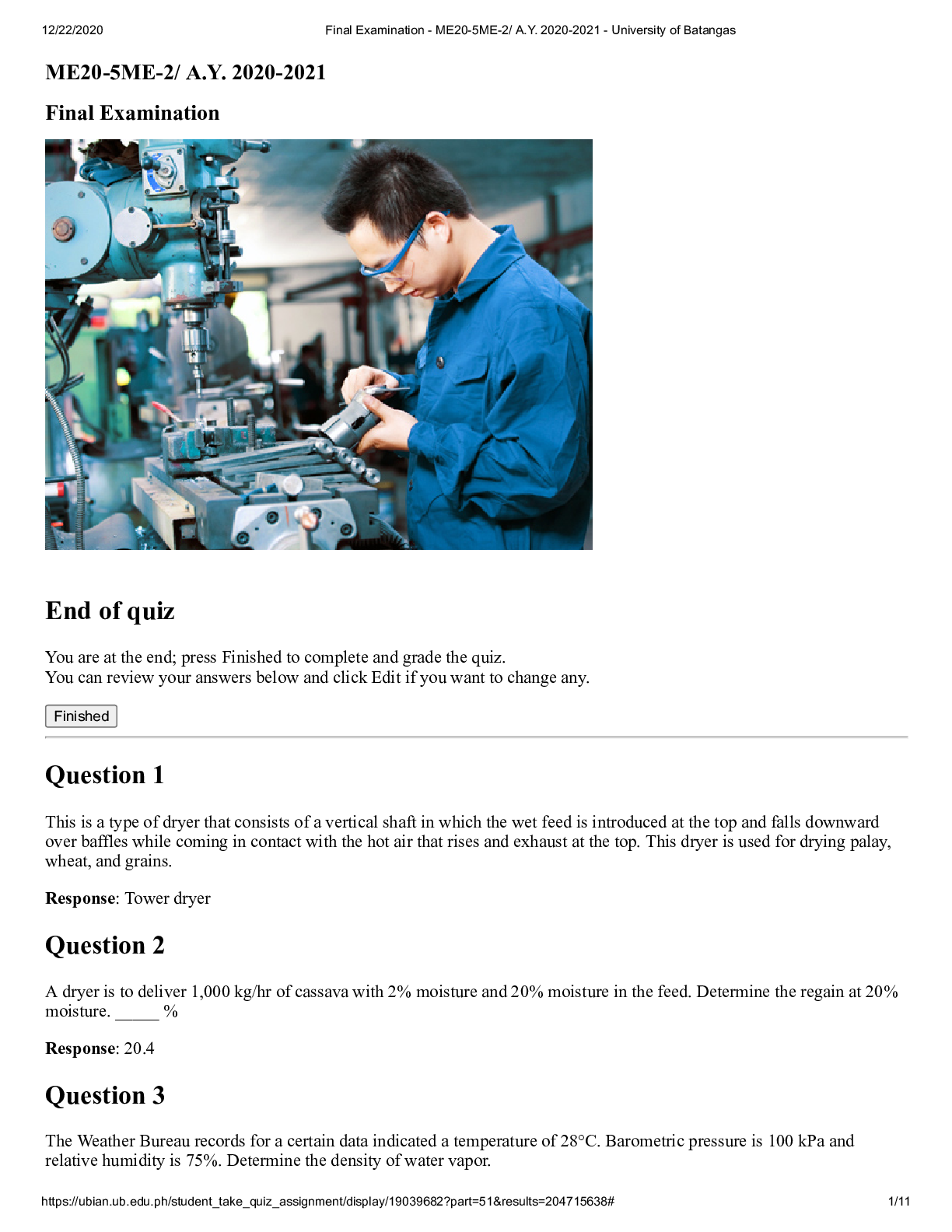 SCIENCE 101 > QUESTIONS & ANSWERS > Final Examination - ME20-5ME-2 A.Y (All)
