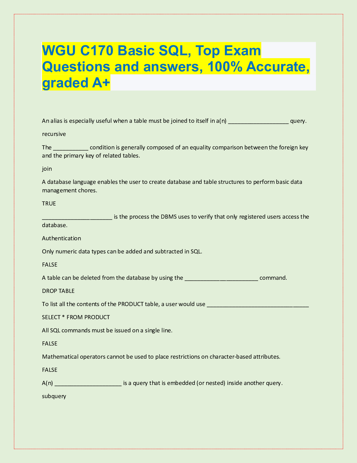 Database Management > EXAM > WGU C170 Basic SQL | 99 Questions And Answers (All)